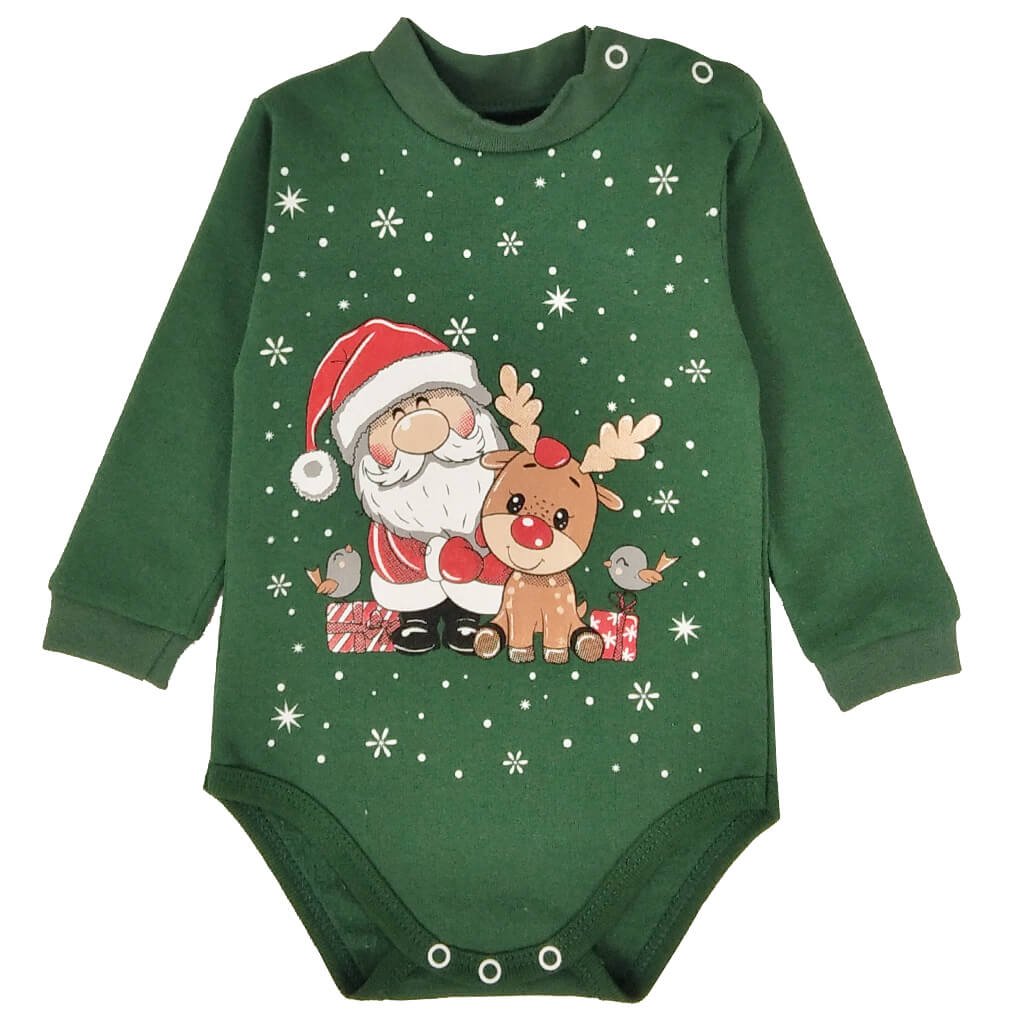Боди- гольф это идеальный вариант одежда на холодное время года. Так шея плотно закрывается стойкой бодика, и малышу не страшны сквозняки. Данная модель, зеленого цвета, новогодний принт, пошита из начесного полотна, которое состоит полностью из хлопка. По низу боди есть кнопки, что облегчает переодевание ребенка. Также на плече есть кнопки. Украшением этого боди является красивый мультяшный рисунок по переду изделия. Также в нашем интернет-магазине вы можете приобрести и другие изделия для малыша, такие например как человечки, штанишки и так далее.