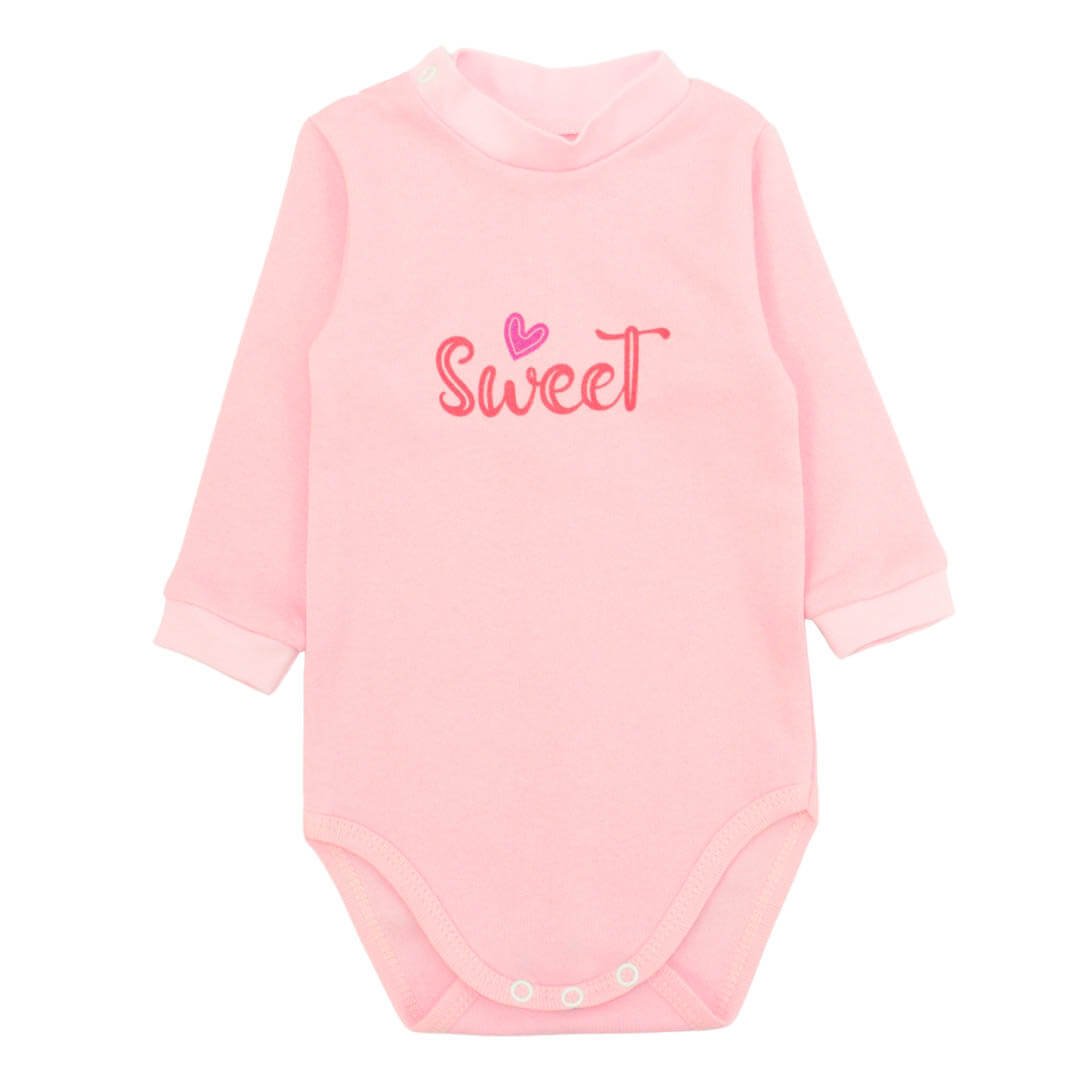 Боди- гольф это идеальный вариант одежда на холодное время года. Так шея плотно закрывается стойкой бодика, и малышу не страшны сквозняки. Данная модель, светло-розового цвета с принтом Sweet, пошита из начесного полотна, которое состоит полностью из хлопка. По низу боди есть кнопки, что облегчает переодевание ребенка. Также на плече есть кнопки. Украшением этого боди является красивый мультяшный рисунок по переду изделия. Также в нашем интернет-магазине вы можете приобрести и другие изделия для малыша, такие например как человечки, штанишки и так далее.