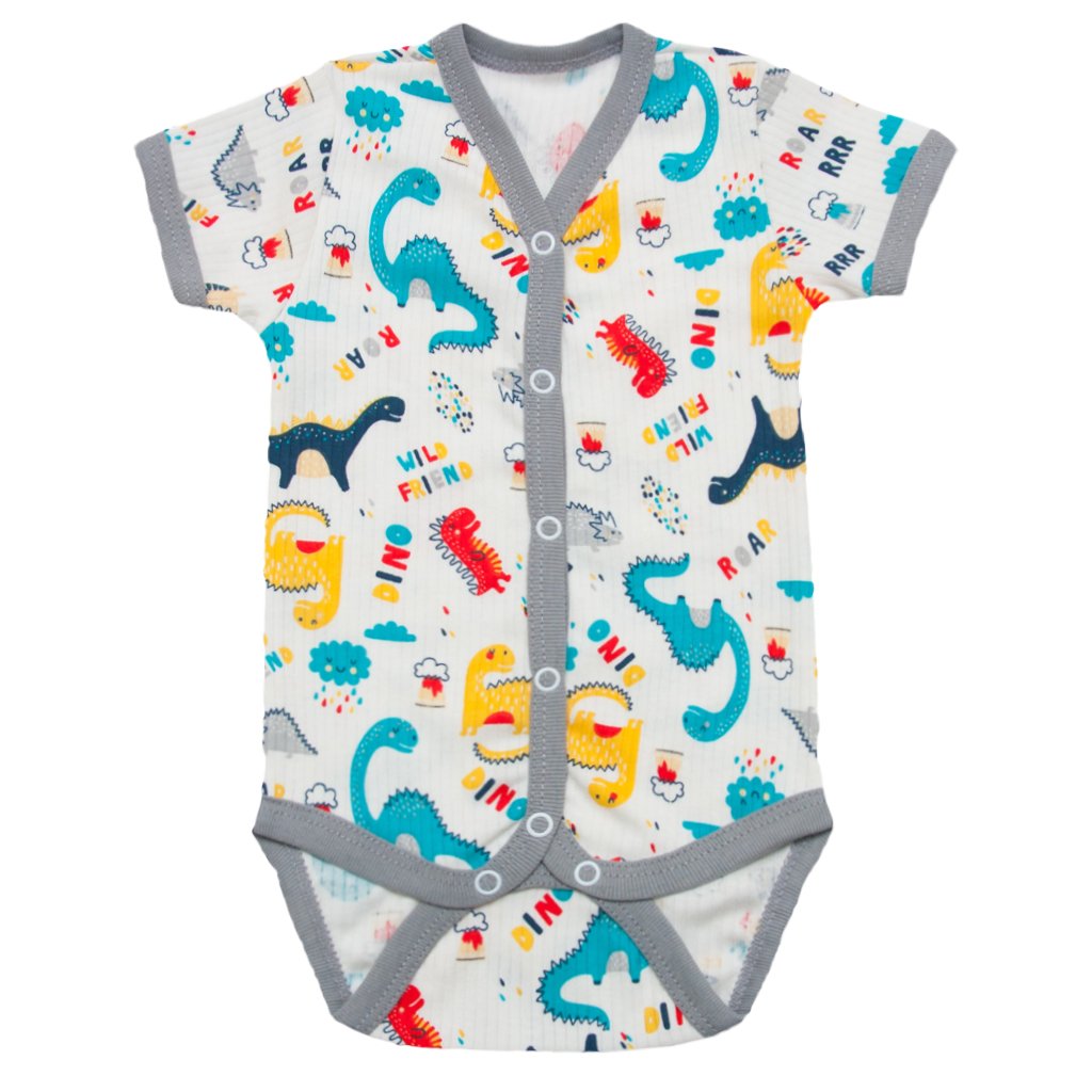 Наш интернет-магазин ТМ "Арлекин" с нетерпением хочет представить Вам идеальную модель детского бодика на лето и весну. Представленный детский боди с коротким рукавом пошит из высококачественного трикотажного полотна - интерлок раппорт белого цвета с серой окантовкой принтом динозавров. Данное полотно невероятно мягкое и приятное на ощупь. Также ткань довольно эластичная, благодаря чему изделие отлично будет сидеть на малыше. Боди застёгивается на кнопочки, которые расположены по переду изделия. Края обработаны бейкой. Такой бодик однозначно станет фаворитом у Вас и у Вашего малыша.