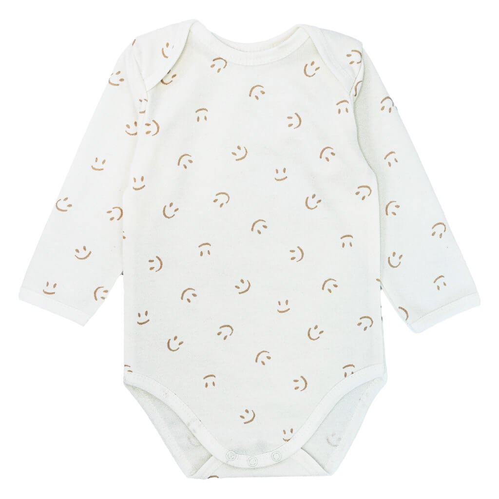 Детский молочный боди принт смайлик с длинным рукавом пошит из высококачественного трикотажного полотна - начеса. Детские бодики давно обрели свою популярность и стали одной из самых необходимых вещей, которые должны быть в гардеробе каждого малыша. Представленная модель детского боди выполнена с горловиной в виде «лодочки» и кнопочками между ножек. По всему полотну присутствуют милые мордочки зверюшек. Края изделия обработаны бейкой в цвет полотна. Такой боди прекрасно подойдёт для прохладной погоды, так как полотно начёс отлично сохраняет тепло и не даст Вашему ребёночку замёрзнуть.