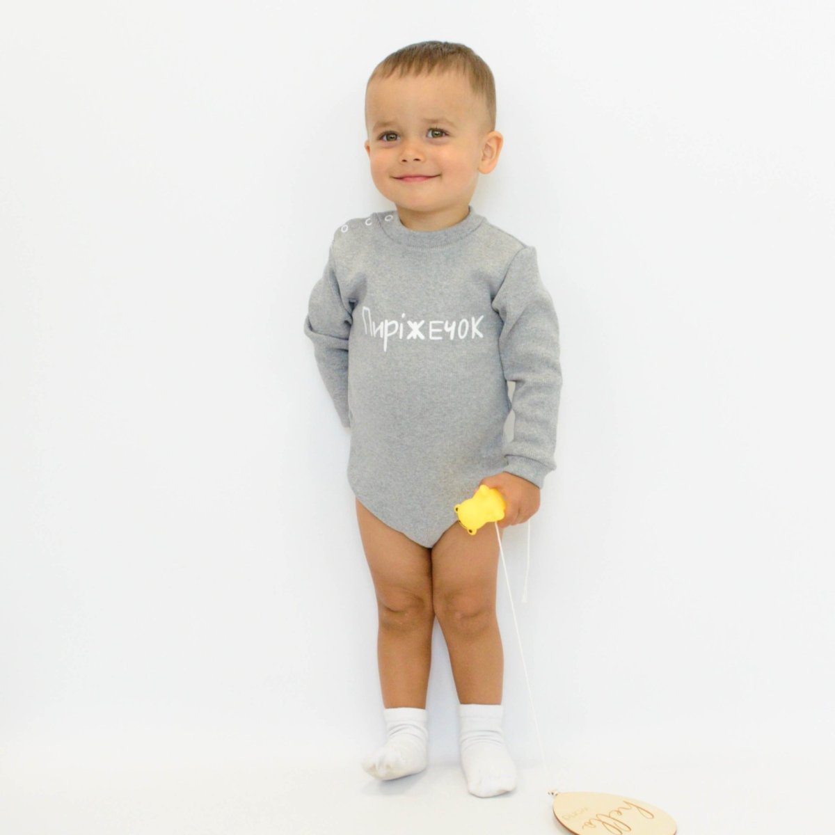 В современном мире детские бодики являются неотъемлемой частью гардероба каждого малыша. Такие изделия отличаются своей практичностью и удобством. Детский боди с длинным рукавом пошит из качественного трикотажного полотна - рубчика с начесным утеплением. Данная модель серого цвета, надпись Пиріжечок. Эластичное и приятное на ощупь полотно обеспечит невероятный комфорт Вашему карапузу. Застёгивается изделие на кнопочки между ножек, что поможет отлично зафиксировать изделие на ребёнке. Также присутствуют кнопки возле горловины. А на передней стороне бодика присутствует невероятно красивая надпись.