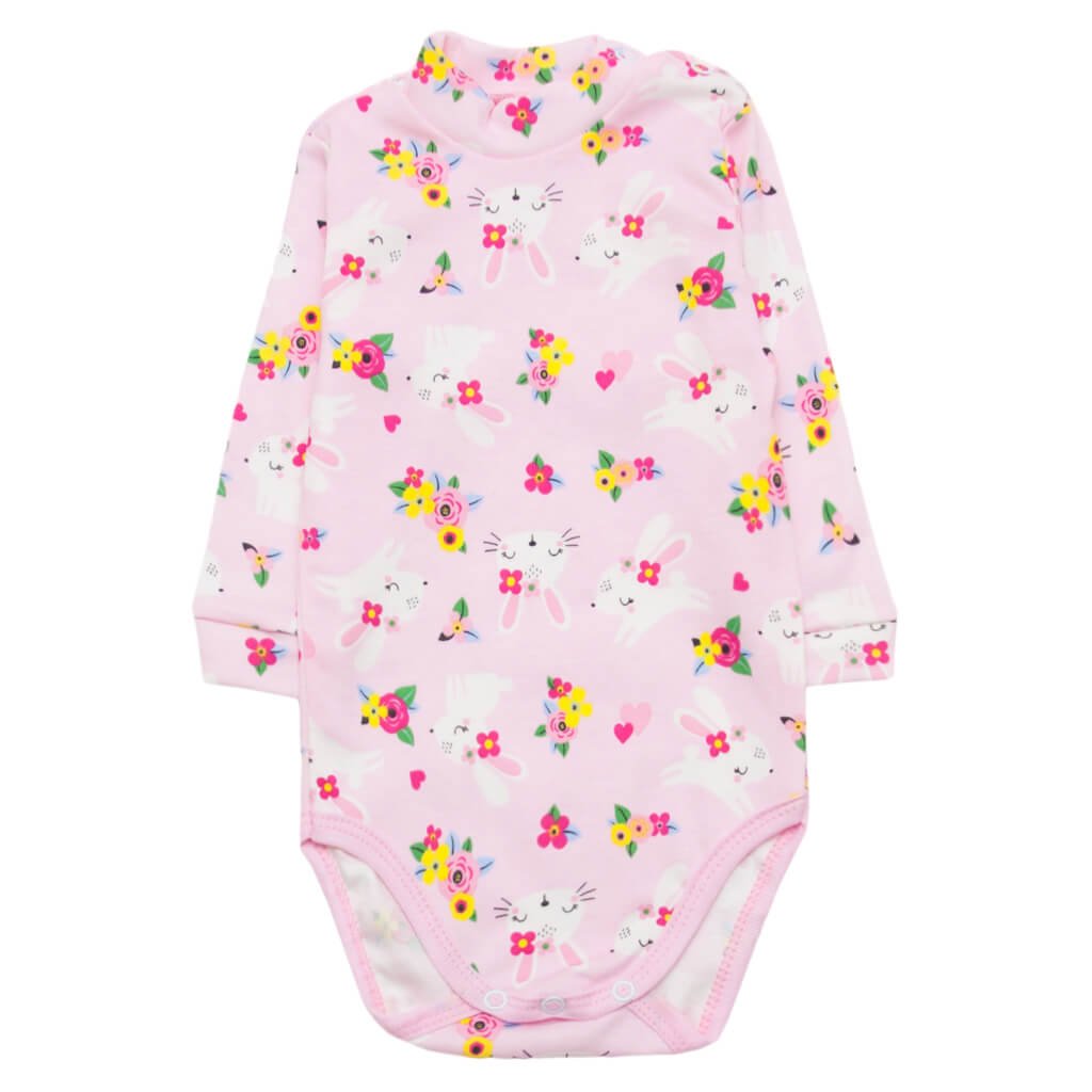 Розовый боди для девочки изготовлено из хлопчатобумажного натурального интерлочного полотна, принт зайка. Полотно хорошего качества, не берется катышками и не садится после стирки. Боди сделан гольфиком, под горлышко, на холодное время года идеальный вариант. На одном плечике есть кнопочки, что облегчает переодевание малышки. Длинный рукавчик и понизу манжет. Бодик по низу обработан бейкой и застегивается на кнопочки. В таком боди Вашей малышке будет комфортно и тепло, а веселые и модные расцветки всегда поднимут настроение маме.