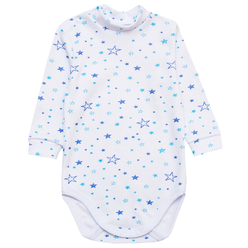 Боди-гольф со звездами, изготовлен из натурального хлопчатобумажного полотна - интерлок. Полотно мягкое, приятное к телу, не вызывает аллергии даже у самых маленьких. После стирки не садится и не кошлатится. Горловинка в бодике сделана стойкой на одном плечике есть кнопочки, что облегчает переодевание малышки. Длинный рукавчик, по низу манжеты из основного полотна. По низу бодика бейка и застежки кнопочки. Нежный, мягкий принт которым украшено полотно, понравится мамочке. Приятных покупок и хорошего настроения.