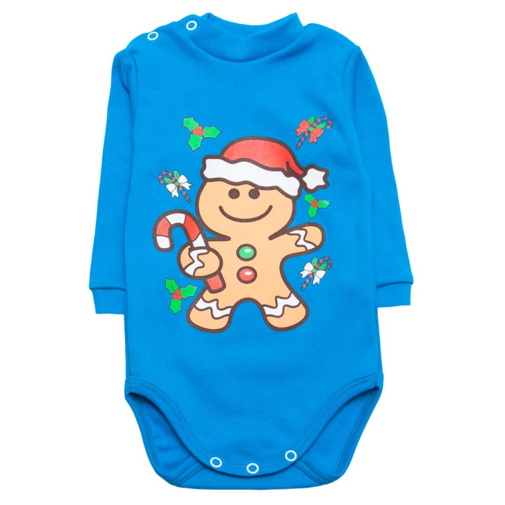Боди-гольф для мальчика, синего цвета, рисунок пряник, изготовлен из начесного интерлока. Полотно очень мягкое и приятное к телу, не вызывает аллергии и подходит для деток с первых дней жизни. Изделия из такого полотна хорошо показывают себя в использовании, материал не кошлатится, и не теряет свою форму, а также сохраняет яркие цвета даже после многочисленных стирок. В боди горловина стойка, на одном плече кнопочки. По низу изделия также есть кнопки, что очень облегчает переодевания младенца. На рукавах по низу манжеты из основного полотна.