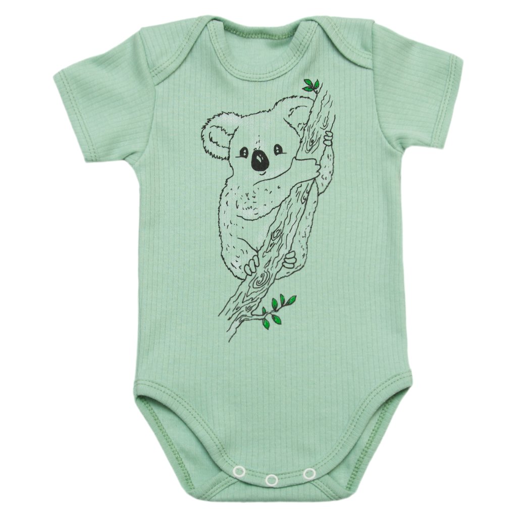 Представленная модель детского бодика объединяет в себе футболочку и трусики, что станет идеальным вариантом для тёплого времени года. Изделие пошито из высококачественного натурального полотна - интерлок рапорт оливкового цвета. Невероятно мягкая и приятная к телу ткань подарит максимальное чувство комфорта Вашему малышу. Также полотно достаточно хорошо тянется, но при этом не растягивается и не теряет свою первоначальную форму. Горловина боди выполнена в виде "лодочки", а низ изделия застёгивается на кнопочки. Бодик украшен красивой покраской Коала на передней стороне .