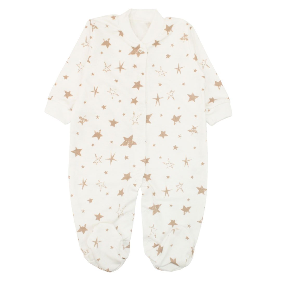 Новая модель детского человечка на кнопках пошита из высококачественного трикотажного материала - начёса молочного цвета с принтом больших звездочек. Мягкое, гладкое и невероятно приятное к телу полотно обеспечит Вашему малышу уют и тепло. Даже после многочисленных стирок, комбинезон будет долго сохранять свой первоначальный вид и нежную структуру. Края горловины и рукавов обработаны манжетами, а ножки у представленной модели закрыты. Человечек украшен различными рисуночками, которые точно оценит Ваш карапуз. Наш интернет-магазин «Арлекин» заботится о своих маленьких клиентах и постоянно готов радовать Вас своими новинками!