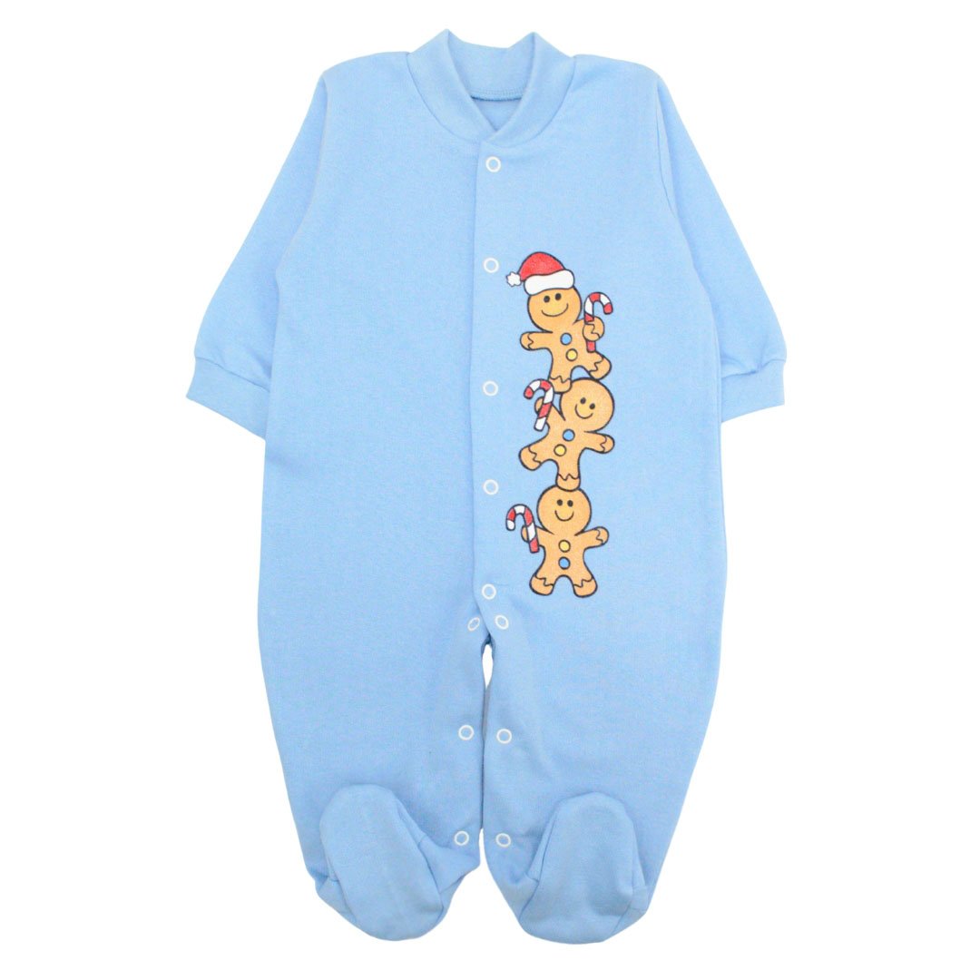 Человечек детский, голубого цвета с рисунком печенья пошит из натурального начесного полотна. По всей длине изделия есть кнопки на которые и застегивается человечек, что позволяет с легкостью переодевать малыша. Воротник сделан стойкой из эластичного манжета, на рукавах также есть манжеты, ножки закрытые. Однотонные цвета дополняют красивые, яркие и веселые покраски по переду человечка, на одной из полочек. Подберите нужный Вам размер, цвет и сделайте заказ в нашем интернет-магазине. И Вашей малышке будет удобно и комфортно в таком человечке.