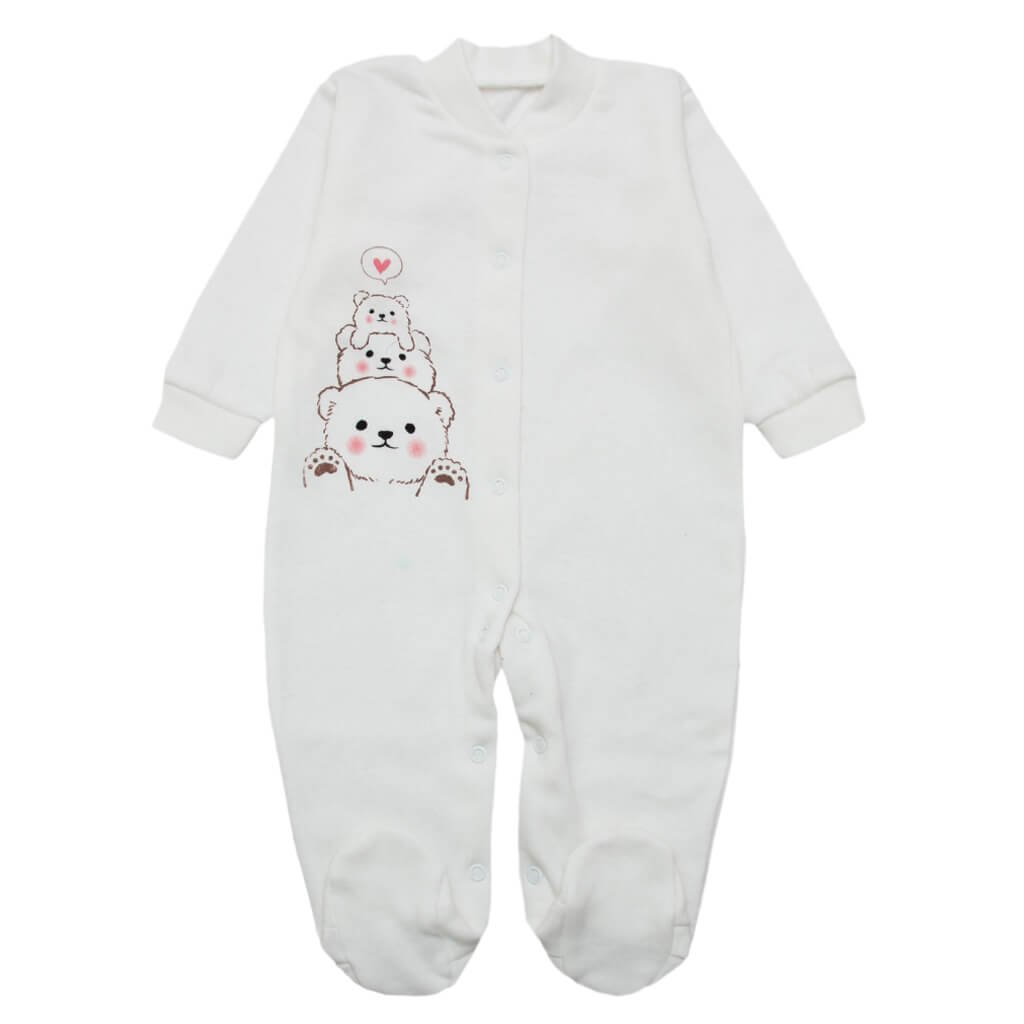 Человечек детский, молочного цвета с рисунком мишек пошит из натурального начесного полотна. По всей длине изделия есть кнопки на которые и застегивается человечек, что позволяет с легкостью переодевать малыша. Воротник сделан стойкой из эластичного манжета, на рукавах также есть манжеты, ножки закрытые. Однотонные цвета дополняют красивые, яркие и веселые покраски по переду человечка, на одной из полочек. Подберите нужный Вам размер, цвет и сделайте заказ в нашем интернет-магазине. И Вашей малышке будет удобно и комфортно в таком человечке.