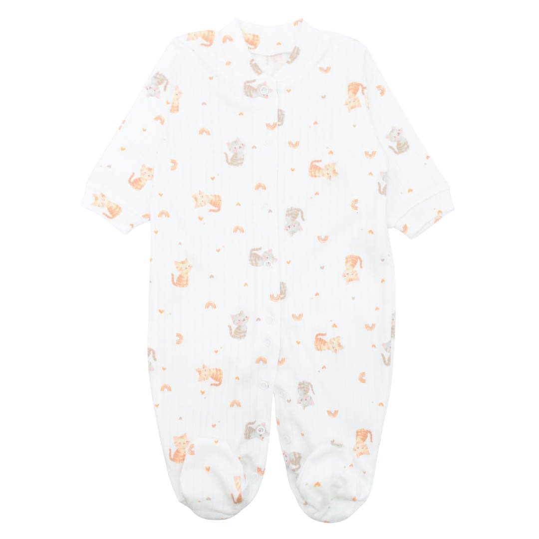 Детский человечек пошит из качественного трикотажного материала - интерлок рапорт молочного цвета с принтом кошечки. Это натуральная, плотная и приятная на ощупь ткань, которая идеально подходит для чувствительной кожи ребёнка. Она обеспечивает хорошую терморегуляцию, позволяя малышу чувствовать себя комфортно как дома, так и на прогулке. Особенность данной модели заключается в открытых ручках и закрытых ножках. Такой дизайн делает человечек идеальным вариантом для активных малышей. Размеры подходят для детей ростом от 68 см до 80 см, что делает эту модель отличным выбором для малышей в возрасте от нескольких месяцев до года. Благодаря удобным кнопкам, которые расположены вдоль изделия, процесс одевания и переодевания ребёнка становится быстрым и комфортным.