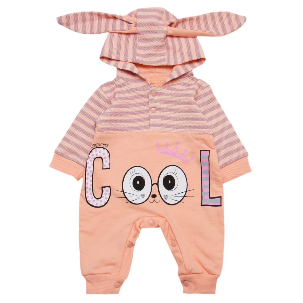Комбинезон для девочки из качественного полотна двухнитка, персикового цвета. Полотно пользуется популярностью в изготовлении не только детской одежды, но и взрослой, так как обладает множеством положительных качеств. Быстро сохнет, легко стирается и сильно не мнеться. Данная модель комбинирована двумя полотнами, однотон и в полосочку, также есть очень забавная вышивка по переду изделия. И все это дополняет капюшон с ушками, все вместе смотрится очень оригинально и интересно. Приобретайте обновочки в нашем интернет-магазине и радуйте деток стильными и качественными обновками.