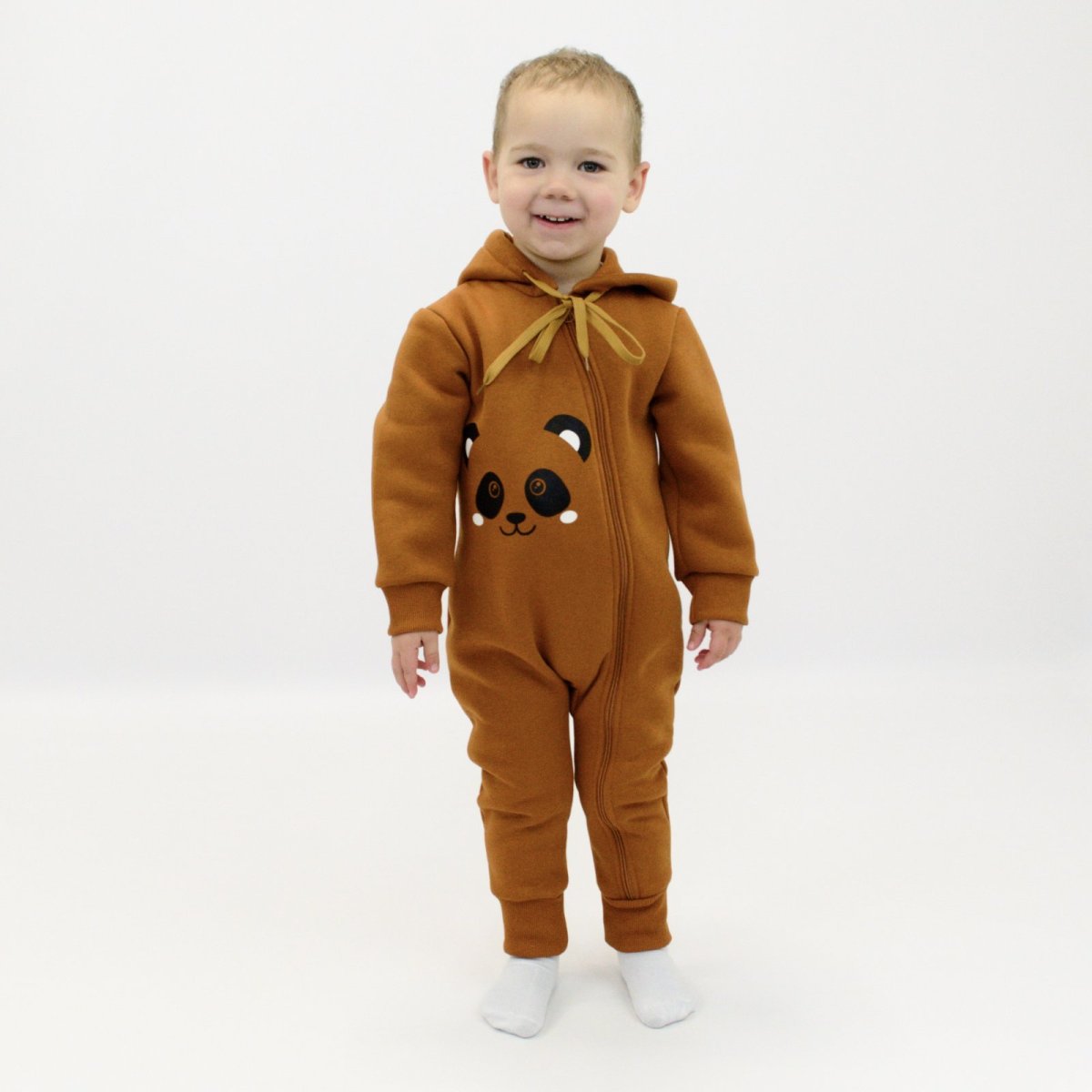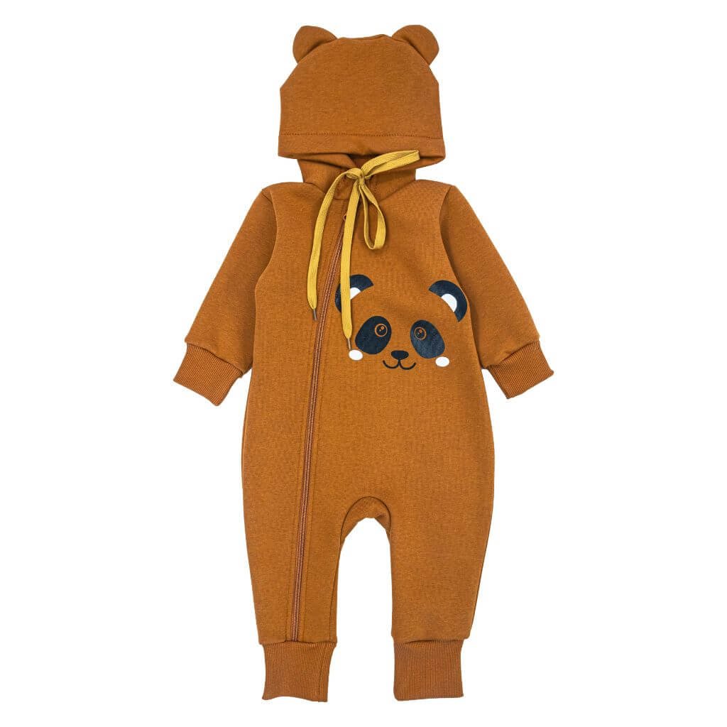 В холодное время года очень важно уделить внимание гардеробу ребёнка. При низкой температуре воздуха и сильных ветрах одежда ребёнка должна быть утеплённая. Трёхнитка с начёсом - это отличное полотно, практически на 100% состоящее из хлопка. Тёплый комбинезон горчичного цвета с принтом панды, с капюшоном изготовлен, как раз-таки, из этого полотна. Детский комбинезон - демисезонный и зимний вариант одежды. Изделие отлично держит форму, не требует дополнительных усилий при глажке. Спереди наискось расположена молния от самого верха и до низа одной ножки. По низу и краю рукавов есть стрейчевые манжеты. Капюшон с ушками и подходящий рисунок смотрится очень мило, точно понравятся малышу.
