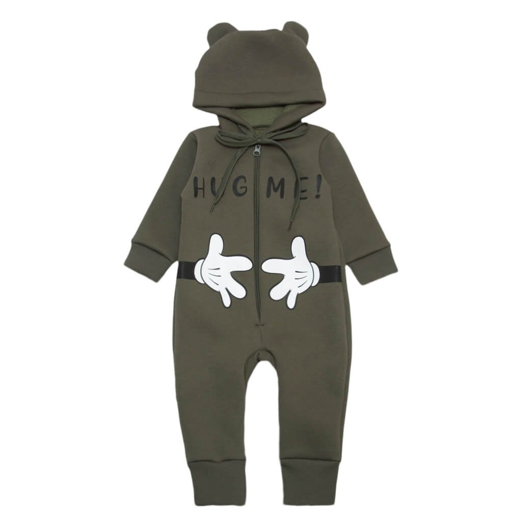 Человечек-комбинезон - самый оптимальный вариант для малышей в холодное время года. Представляем Вашему вниманию новую модель детского комбинезона с утеплением цвета хаки с надписью HUG ME. Сам человечек пошит из высококачественного трикотажного полотна - трёхнитка. Ножки и ручки у данной модели человечка открыты. Комбинезон застёгивается на молнию спереди и, благодаря этому, Вы с лёгкостью можете одеть своего карапуза. Также присутствует капюшон с милыми ушками. Порадуйте своего ребёночка несколькими невероятными обновочками с нашего интернет-магазина!