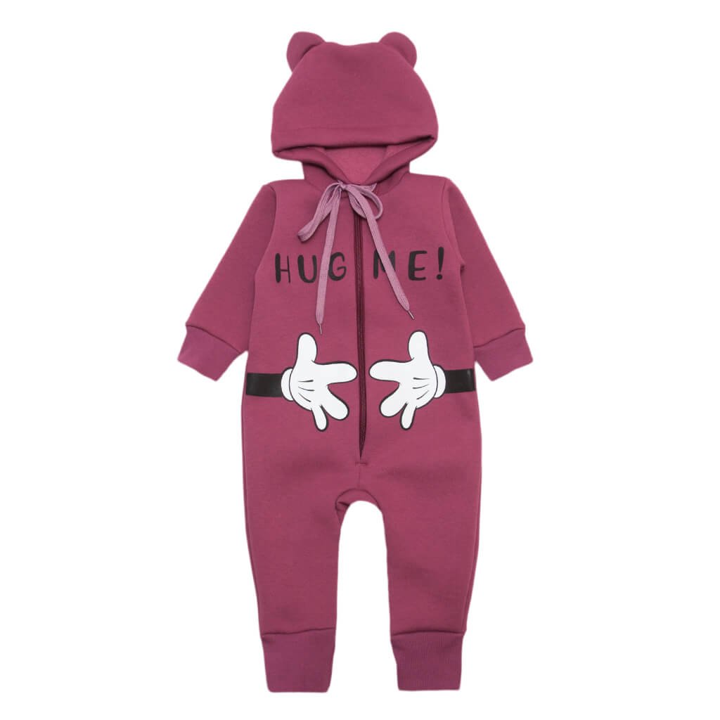 Человечек-комбинезон - самый оптимальный вариант для малышей в холодное время года. Представляем Вашему вниманию новую модель детского комбинезона с утеплением сливового цвета с надписью HUG ME. Сам человечек пошит из высококачественного трикотажного полотна - трёхнитка. Ножки и ручки у данной модели человечка открыты. Комбинезон застёгивается на молнию спереди и, благодаря этому, Вы с лёгкостью можете одеть своего карапуза. Также присутствует капюшон с милыми ушками. Порадуйте своего ребёночка несколькими невероятными обновочками с нашего интернет-магазина!