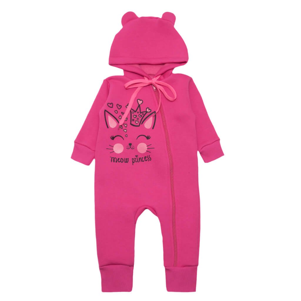 В холодное время года очень важно уделить внимание гардеробу ребёнка. При низкой температуре воздуха и сильных ветрах одежда ребёнка должна быть утеплённая. Трёхнитка с начёсом - это отличное полотно, практически на 100% состоящее из хлопка. Тёплый комбинезон малинового цвета с принтом кошечки с капюшоном изготовлен, как раз-таки, из этого полотна. Детский комбинезон - демисезонный и зимний вариант одежды. Изделие отлично держит форму, не требует дополнительных усилий при глажке. Спереди наискось расположена молния от самого верха и до низа одной ножки. По низу и краю рукавов есть стрейчевые манжеты. Капюшон с ушками и подходящий рисунок смотрится очень мило, точно понравятся малышу.