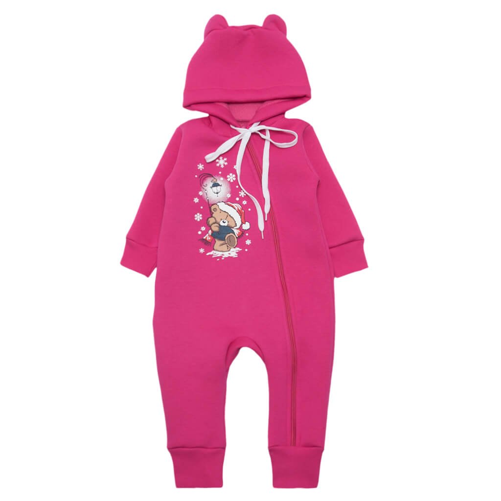 В холодное время года очень важно уделить внимание гардеробу ребёнка. При низкой температуре воздуха и сильных ветрах одежда ребёнка должна быть утеплённая. Трёхнитка с начёсом - это отличное полотно, практически на 100% состоящее из хлопка. Тёплый комбинезон малинового цвета с принтом новогоднего мишки, с капюшоном изготовлен, как раз-таки, из этого полотна. Детский комбинезон - демисезонный и зимний вариант одежды. Изделие отлично держит форму, не требует дополнительных усилий при глажке. Спереди наискось расположена молния от самого верха и до низа одной ножки. По низу и краю рукавов есть стрейчевые манжеты. Капюшон с ушками и подходящий рисунок смотрится очень мило, точно понравятся малышу.