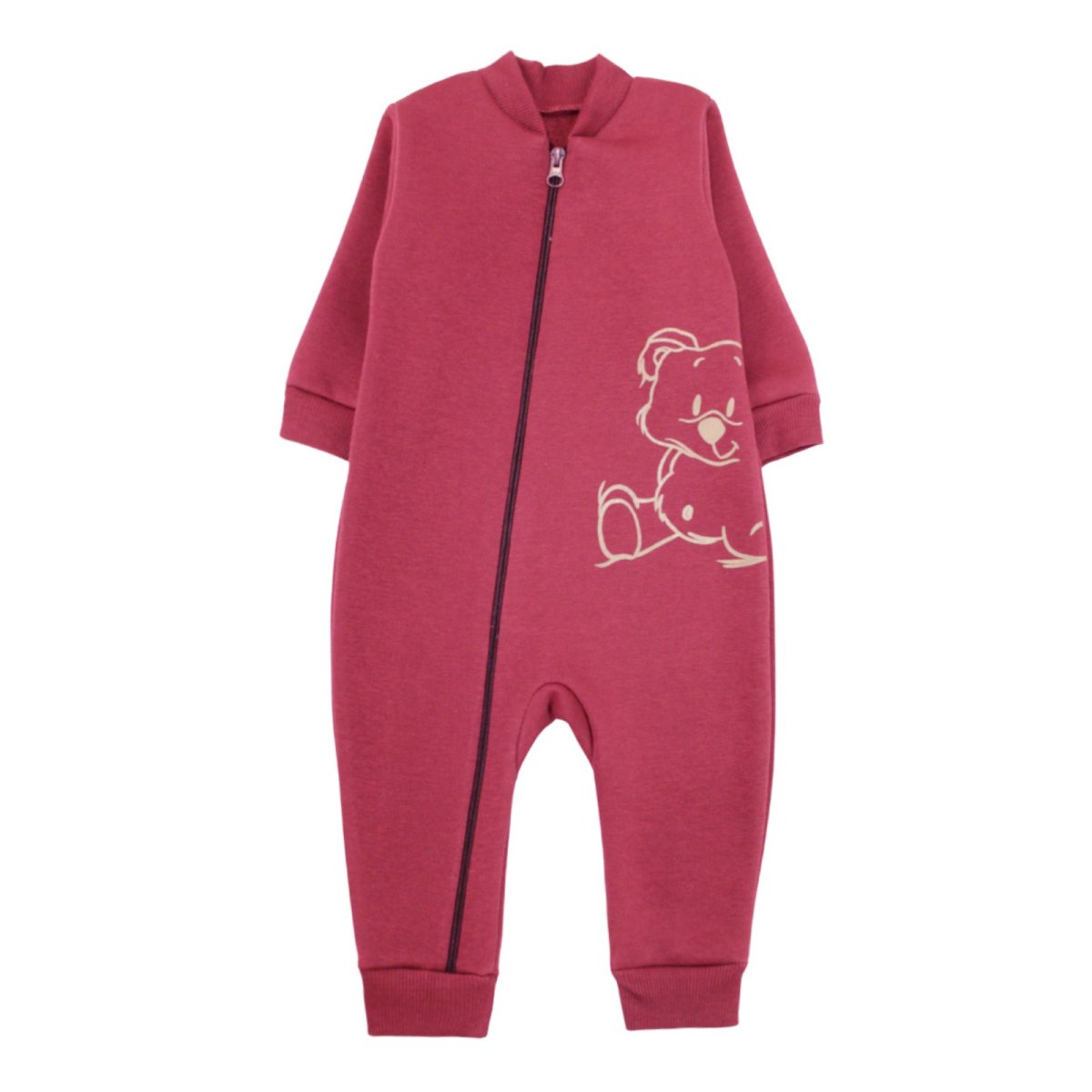 Детский ромпер из тринитки с открытыми ручками и ножками станет любимой вещью гардероба Вашего ребенка, ведь он очень теплый и комфортный во время носки. На зиму и демисезон детскую одежду из тринитки невозможно заменить чем-нибудь другим. Мы используем качественную турецкую тринитку с плотным утеплением изнутри, так что качество гарантировано. Комбинезон сливового цвета без капюшона, до самого низа одной ножки расстегивается на молнии и имеет красивый рисунок мишки спереди. Такой ромпер можно носить в качестве верхней одежды, если погода позволяет, или одевать под низ теплой куртки и комбинезона.