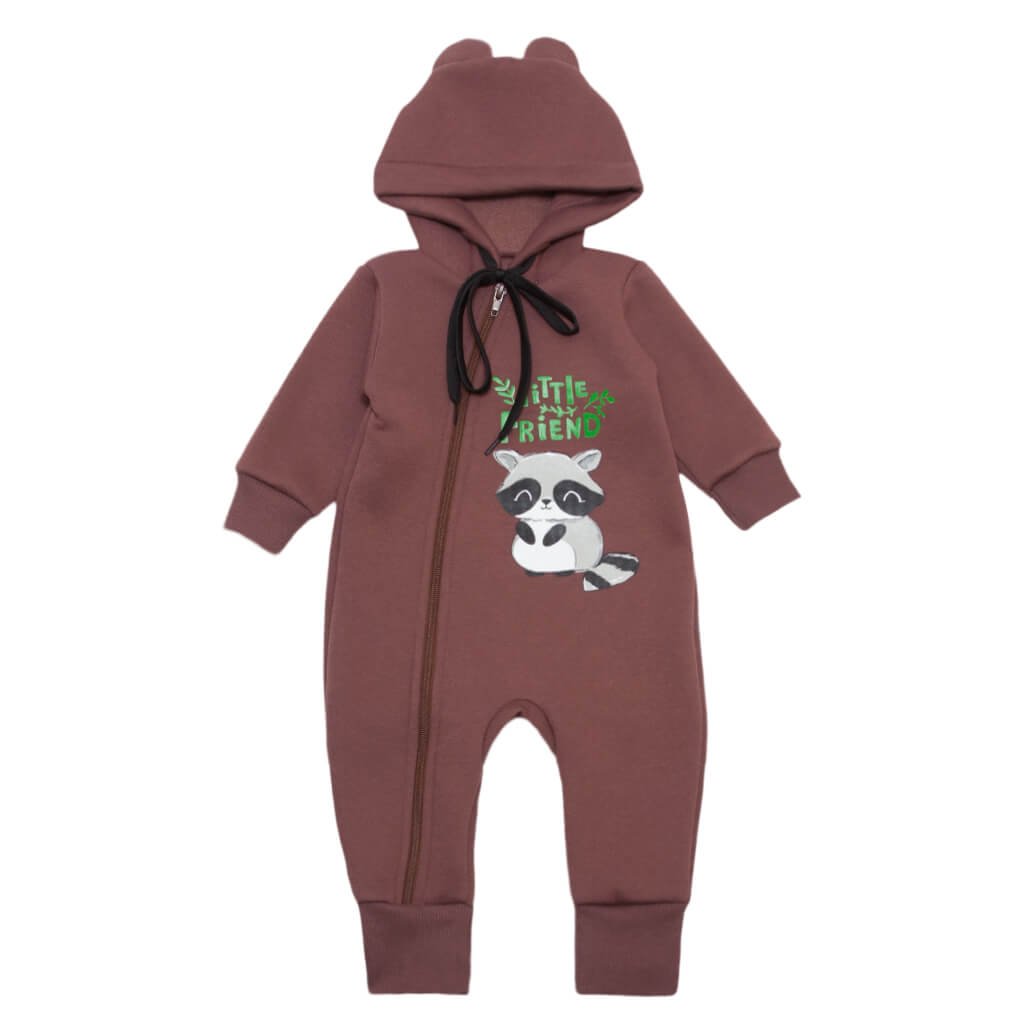 В холодное время года очень важно уделить внимание гардеробу ребёнка. При низкой температуре воздуха и сильных ветрах одежда ребёнка должна быть утеплённая. Трёхнитка с начёсом - это отличное полотно, практически на 100% состоящее из хлопка. Тёплый комбинезон цвета шоколад с принтом енота с капюшоном изготовлен, как раз-таки, из этого полотна. Детский комбинезон - демисезонный и зимний вариант одежды. Изделие отлично держит форму, не требует дополнительных усилий при глажке. Спереди наискось расположена молния от самого верха и до низа одной ножки. По низу и краю рукавов есть стрейчевые манжеты. Капюшон с ушками и подходящий рисунок смотрится очень мило, точно понравятся малышу.