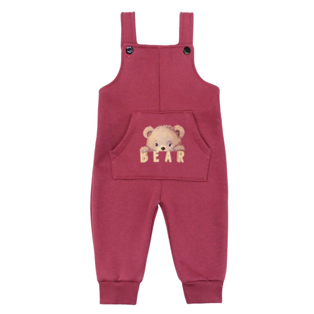 Тёплый уют начинается с мелочей - и этот детский комбинезон создан, чтобы каждая прогулка приносила только комфорт и радость. Модель выполнена из мягкого полотна трёхнитки с начёсом сливового цвета с надписью Bear, которое прекрасно удерживает тепло и остаётся нежным к коже малыша. Комбинезон имеет продуманный фасон с удобными лямками на пуговицах. Спереди расположен карман с очаровательным принтом. Манжеты по низу брюк мягко прилегают, не давят и не позволяют холодному воздуху проникать внутрь. Сзади предусмотрена эластичная резинка, обеспечивающая идеальную посадку. Идеальный выбор для осени и зимы - стильный, тёплый и невероятно уютный.