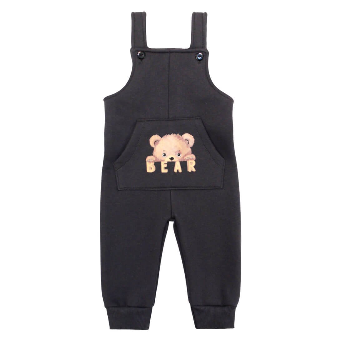 Тёплый уют начинается с мелочей - и этот детский комбинезон создан, чтобы каждая прогулка приносила только комфорт и радость. Модель выполнена из мягкого полотна трёхнитки с начёсом темно-серого цвета с надписью Bear, которое прекрасно удерживает тепло и остаётся нежным к коже малыша. Комбинезон имеет продуманный фасон с удобными лямками на пуговицах. Спереди расположен карман с очаровательным принтом. Манжеты по низу брюк мягко прилегают, не давят и не позволяют холодному воздуху проникать внутрь. Сзади предусмотрена эластичная резинка, обеспечивающая идеальную посадку. Идеальный выбор для осени и зимы - стильный, тёплый и невероятно уютный.