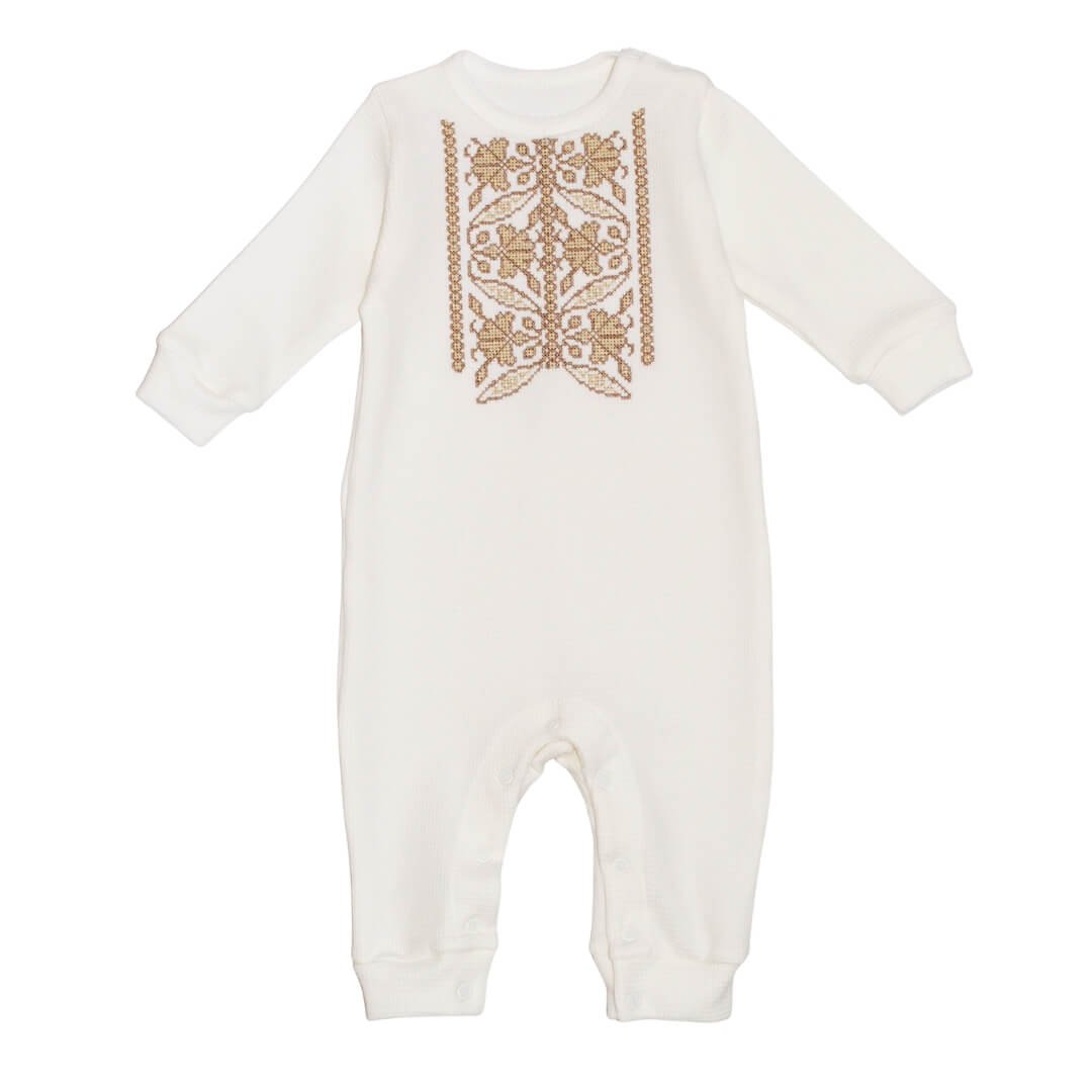 С первого взгляда этот детский ромпер привлекает своей продуманной простотой. Изготовлен из мягкого полотна интерлок вафелька молочного цвета, которое приятно на ощупь, хорошо пропускает воздух и подходит для нежной детской кожи. Однотонный цвет гармонично дополнен вышивкой цветочков на груди, придающей модели особенный акцент. Для удобства родителей и малыша предусмотрены кнопки между ножек, которые позволяют быстро переодеть ребёнка, а также застёжки возле горловины. Ромпер представлен в нескольких расцветках и легко может стать как повседневной одеждой, так и праздничным вариантом для самых маленьких.