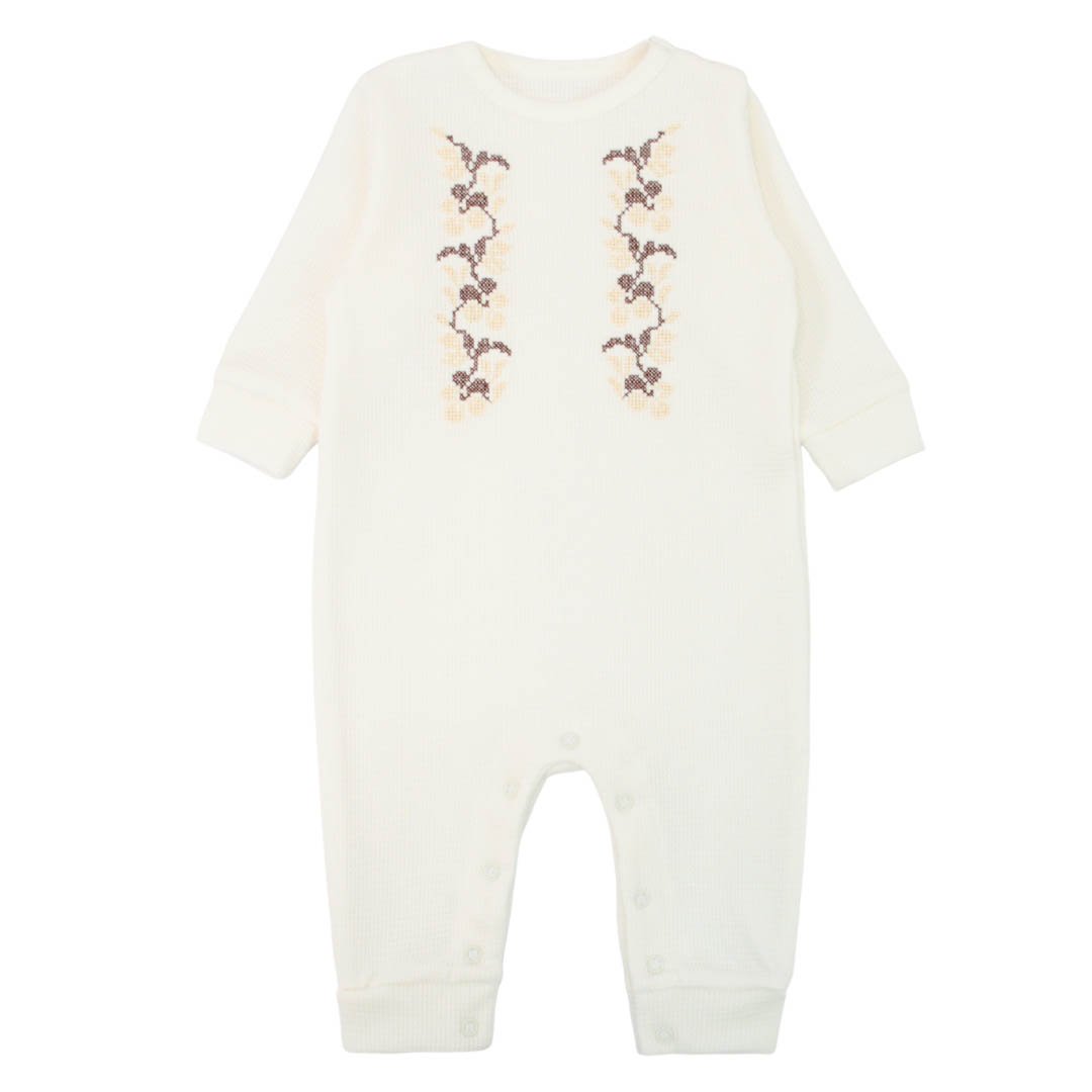 С первого взгляда этот детский ромпер привлекает своей продуманной простотой. Изготовлен из мягкого полотна интерлок вафелька молочного цвета, которое приятно на ощупь, хорошо пропускает воздух и подходит для нежной детской кожи. Однотонный цвет гармонично дополнен вышивкой ягодок на груди, придающей модели особенный акцент. Для удобства родителей и малыша предусмотрены кнопки между ножек, которые позволяют быстро переодеть ребёнка, а также застёжки возле горловины. Ромпер представлен в нескольких расцветках и легко может стать как повседневной одеждой, так и праздничным вариантом для самых маленьких.