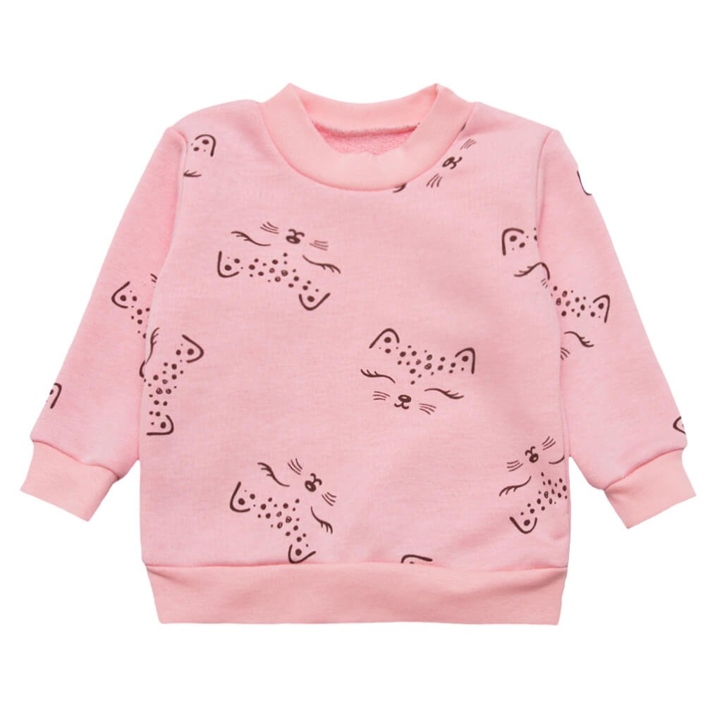 Невероятно модную и стильную детскую кофточку Вы можете приобрести в нашем интернет-магазине. Изготовлено изделие из мягкого и качественного полотна 3-х нитка петля в персиковом цвете. По всему полотну присутствуют рисуночки котиков, что придает данной кофте оригинальности. Манжеты расположены на горловине, на руках, а также понизу изделия. Такая кофточка точно понравиться Вашей маленькой моднице. Советуем Вам скорее выбрать нужный Вам размер, сделать заказ в нашем интернет-магазине "Арлекин" и порадовать себя и своего малыша обновочками! Приятных покупок.