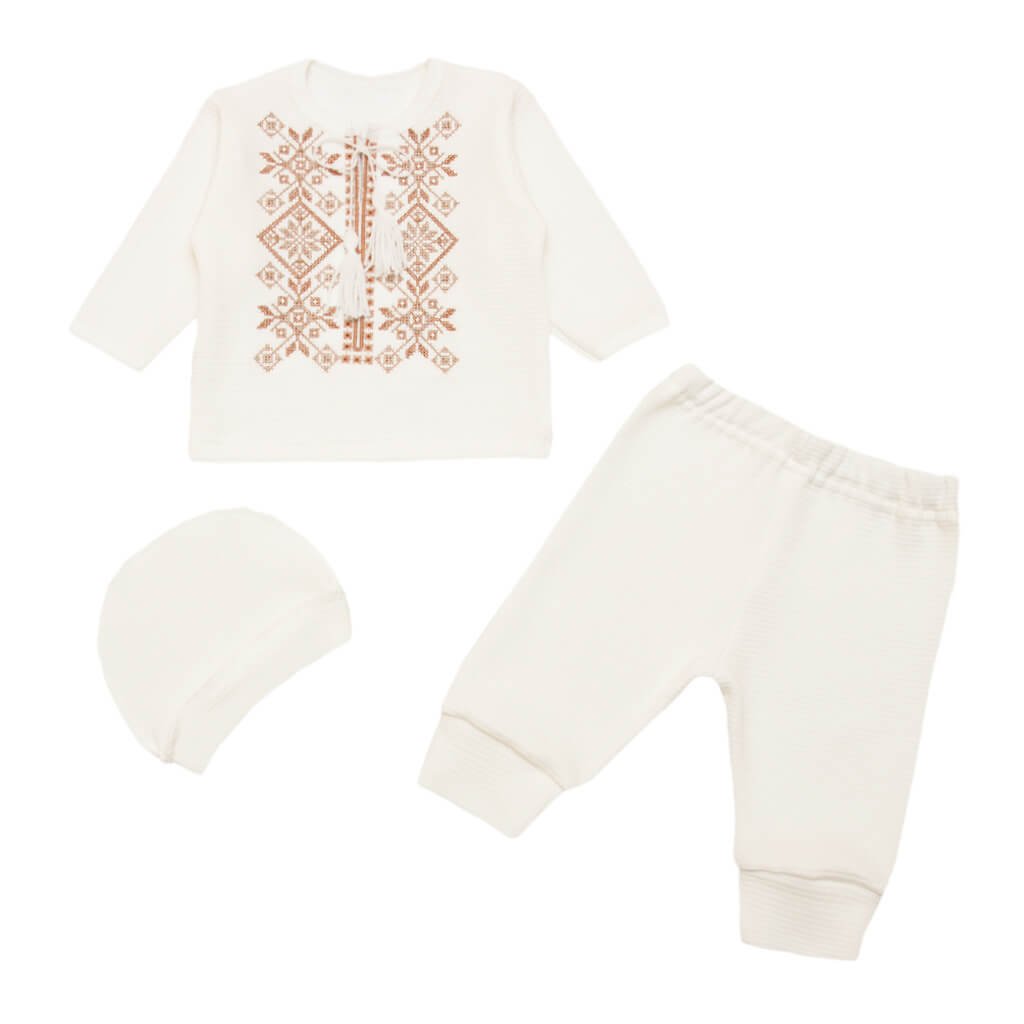 Особенные моменты в жизни малыша требуют не менее особенного наряда - именно такой перед вами. Комплект из полотна интерлок-вафелька молочного цвета подарит не только комфорт, но и праздничное настроение. Кофточка украшена вышивкой в традиционном стиле, что придаёт образу торжественность. Мягкие штанишки с эластичной резинкой и шапочка гармонично дополняют образ. Благодаря своей универсальности комплект идеально подойдёт как для крестин, так и для других важных событий в жизни малыша. Интерлок-вафелька отличается мягкостью, прочностью и отличной воздухопроницаемостью, что особенно важно для чувствительной детской кожи.
