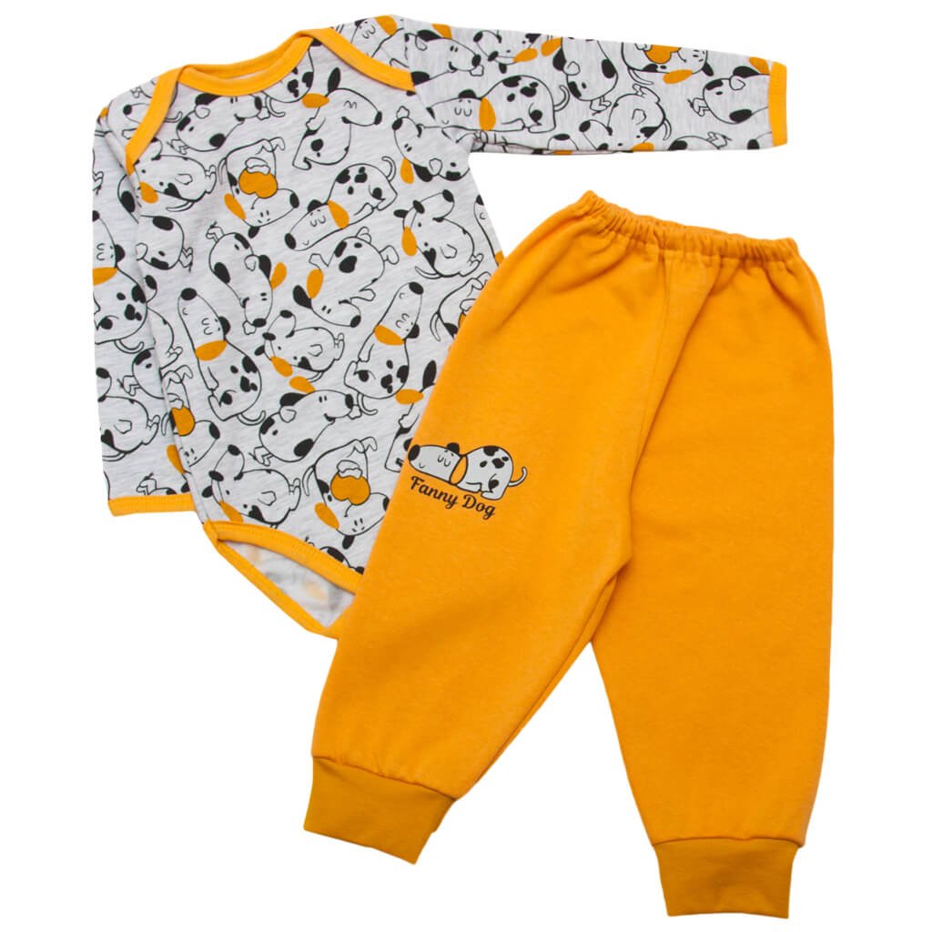 Комплект бодика с длинным рукавом и штанишками станет незаменимой вещью в гардеробе Вашего малыша. Изделия изготовлены из высококачественного начесного полотна, в составе которого присутствует натуральный хлопок. Горловина боди выполнена в виде «лодочки», застёгивается изделие на кнопочки, которые расположены между ножек. Штанишки на мягкой резиночке. Боди пошит из ткани серого цвета с рисунком собачек, а однотонные штанишки дополнены небольшой покраской на передней стороне. Такие комплекты очень удобные и универсальные. Кроме того, что они уже создают цельный образ, изделия также можно носить и по отдельности.