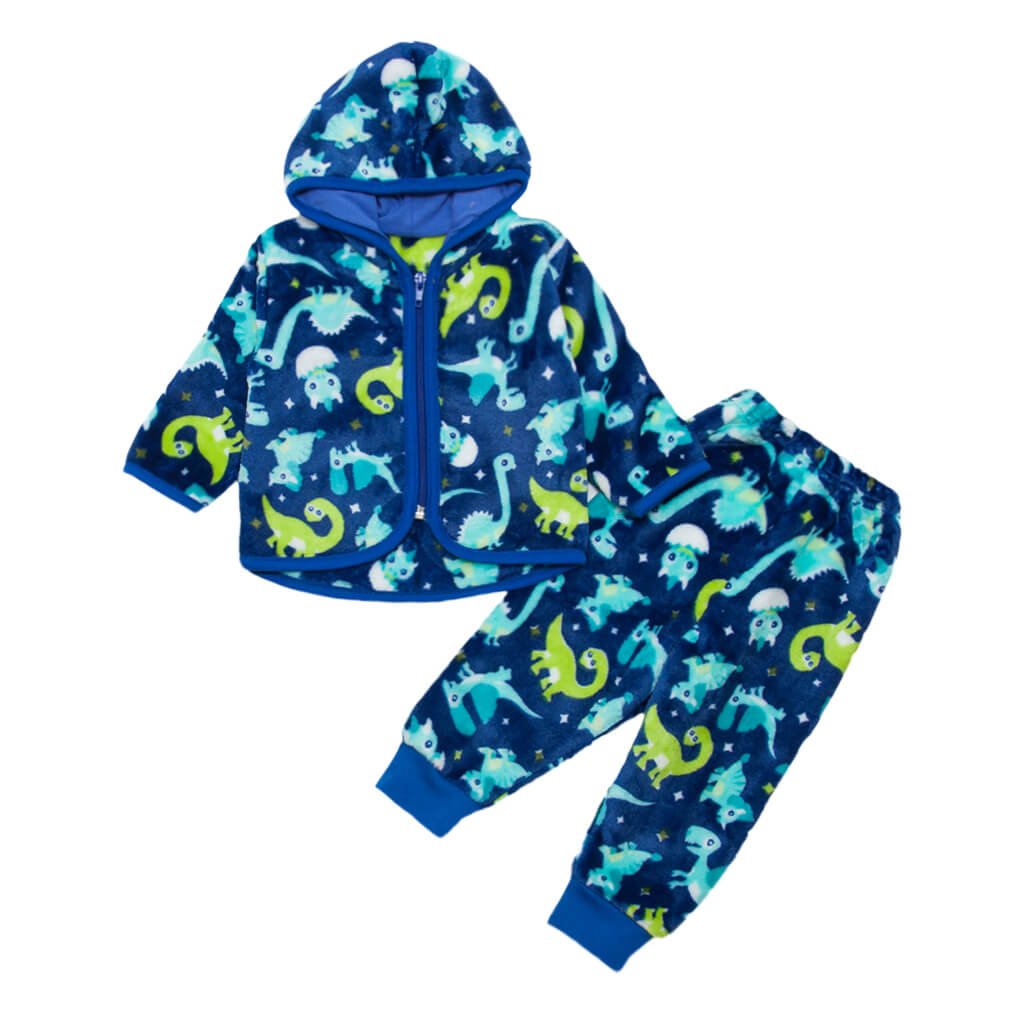 Теплый комплект для мальчика, синего цвета принт динозавры изготовлен из полотна - махра. Изделия из такого полотна пользуются большим спросом, за счет своих качеств. Полотно теплое, не привередливое в уходе, не кошлатится и не теряет форму после стирки. Комплект состоит из кофточки и штанишек. Кофта застегивается на молнию по переду, также есть капюшон. Рукава и все края кофточки обработаны руликом. На штанишках по низу манжеты из стрейча, в пояс вставлена эластичная резиночка. В таком костюмчике Ваш ребенок будет выглядеть очень красиво, и к тому же ему будет тепло и комфортно.