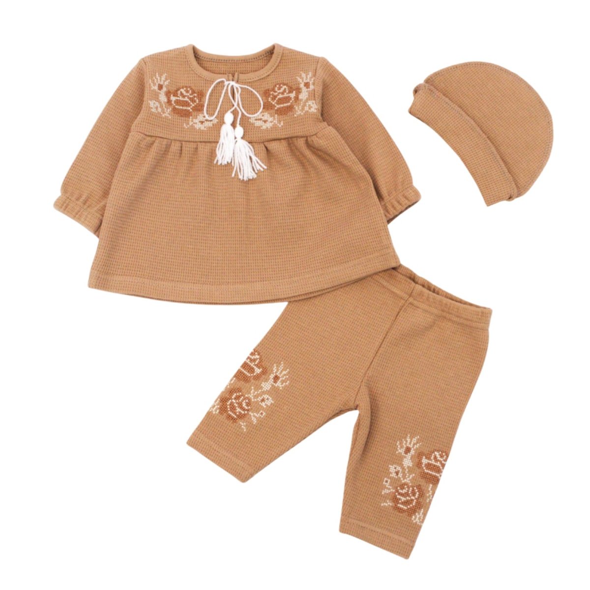 Для самых маленьких важны и внешний вид, и удобство, и данный комплект удачно сочетает оба этих качества. Он выполнен из мягкого полотна интерлок вафелька бежевого цвета, которое приятно на ощупь, хорошо пропускает воздух и подходит даже для самой чувствительной кожи. В набор входят туника с длинными рукавами, украшенная вышивкой с цветочным рисунком, удобные штанишки с таким же узором и шапочка, обеспечивающая дополнительное тепло. Эластичная резинка на поясе брючек мягко фиксирует их, не сковывая движений ребёнка. Застёжка на завязки делает тунику удобной для переодевания.