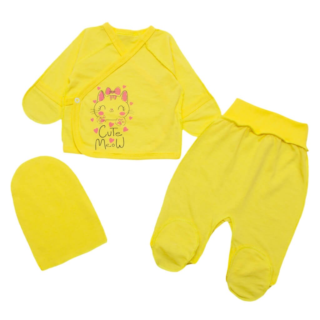 Новый комплект для малышей от ТМ Арлекин - идеальное решение для заботливых родителей, стремящихся обеспечить своему малышу максимальный уровень комфорта и удобства. Представленный комплект изготовлен из качественного материала - кулир желтого цвета, которое полностью состоит из натурального и гипоаллергенного хлопка. В комплект входит распашонка на запах, ползунки с широким эластичным поясом и шапочки. Благодаря высокому качеству полотна, все изделия подарят Вашему малышу максимальное чувство комфорта и уюта. Комплект представлен в нескольких приятных расцветках, а на распашонке есть милая покраска кошечки.