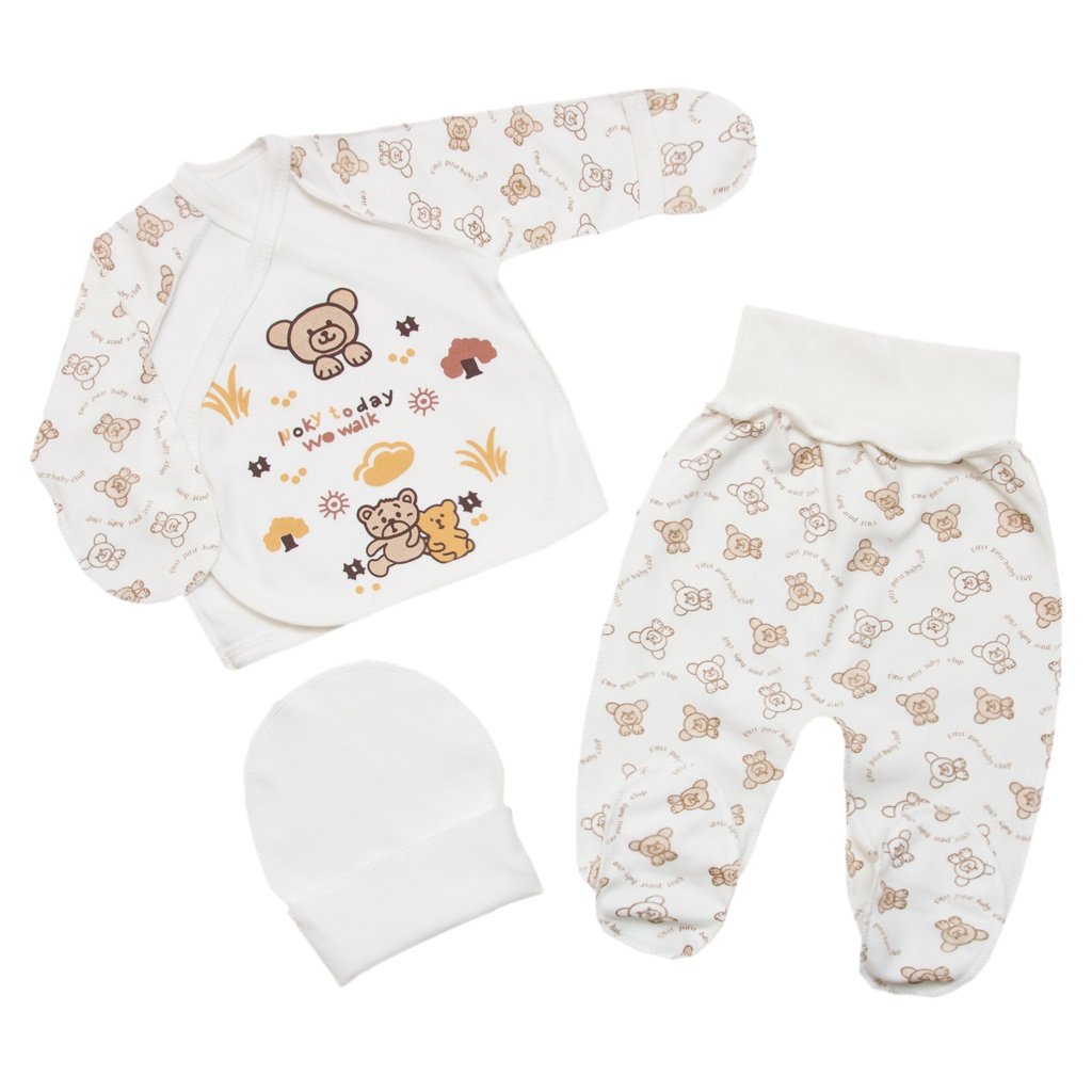 Интерлок – качественное полотно, которое чаще всего используется для пошива детской одежды. В нашем интернет-магазине Вы можете найти множество детских вещей из данной ткани. В этот раз мы хотим представить Вашему вниманию молочный ясельный комплект который подойдет как мальчику так и девочке. Состоит данная модель из распашонки, штанишек и шапочки. Для удобства ручки и ножки закрыты, чтобы малыш случайным образом не нанёс себе царапины. На самой распашонке есть милая покраска. Такой дизайн комплекта Вам точно понравится, потому что ручки и штанишки изготовлены из полотна с рисуночками, а основная часть распашонки и шапочка из однотонного полотна.