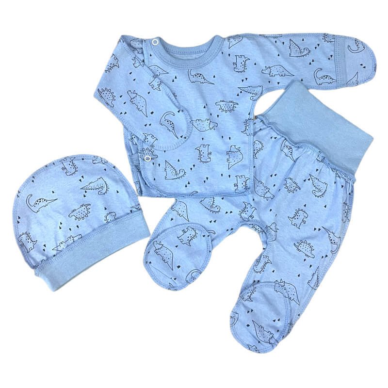 В нашем интернет-магазине «Арлекин» представлен большой и разнообразный выбор ясельной одежды. Распашонки и ползунки - первая одежда каждого малыша, поэтому к выбору таких изделий нужно подходить с особой тщательностью. Вашему вниманию представлен новый голубой комплект для самых маленьких, который состоит из распашонки, ползунков и шапочки. Все изделия выполнены из натурального трикотажного полотна - кулира. Рукава распашонки и ножки ползунков закрыты, что бы обезопасить ребёнка от внешних повреждений. Широкий манжет шапочки хорошо закрепит изделие на голове малыша.