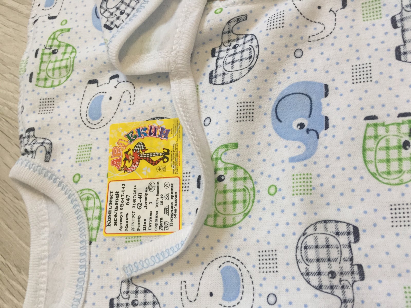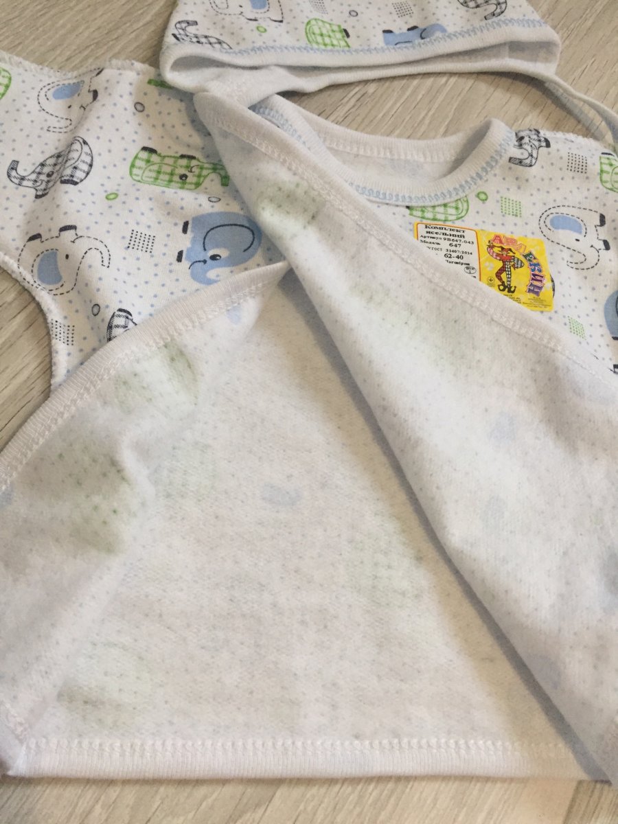 Тканина приємна та м'яка, після прання костюмчик форму не втратив. Шви назовні. Сподіваюсь малюку буде комфотно в такому вбранні.
