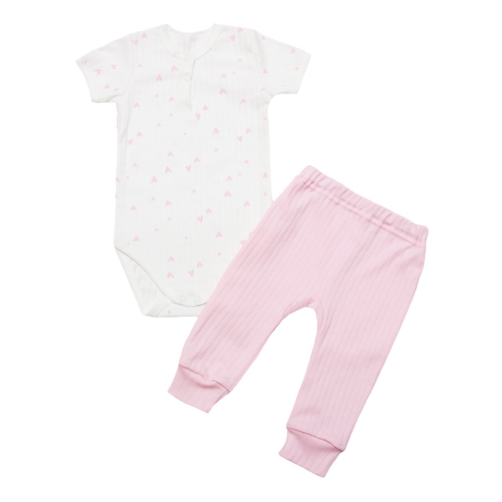 Удобство и стиль в одном комплекте, который состоит из боди молочного цвета с принтом сердечек с короткими рукавами и розовых однотонных штанишек. Изделия выполнены из высококачественного трикотажного полотна - интерлок рапорт. Удобные кнопочки на горловине боди и между ножек делают процесс переодевания быстрым и лёгким. Штанишки выполнены из однотонного материала, с резинкой на талии и манжетами внизу, что гарантирует идеальную посадку и комфорт при движении. Такой комплект станет отличным выбором для ежедневных прогулок или активных игр, создавая стиль и удобство для Вашего малыша.