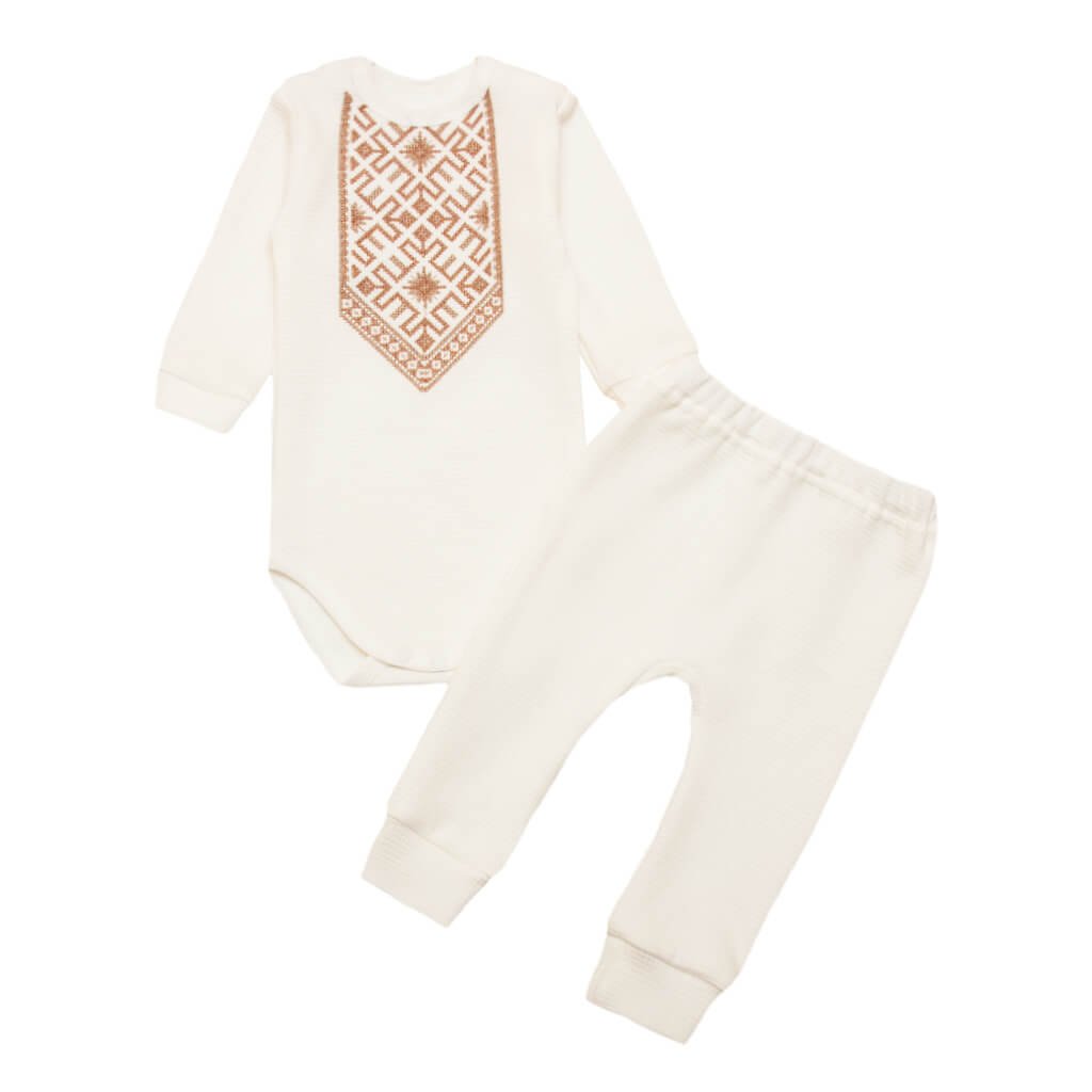 Каждая деталь этого нежного комплекта молочного цвета словно создана с заботой и теплом для самых маленьких. В его составе - удобный боди и мягкие штанишки из интерлока вафелька, идеально подходящего для чувствительной кожи новорождённых. На груди боди расположена вышивка в этническом стиле, придающая образу особую торжественность. Кнопочки в нижней части обеспечивают комфортную смену подгузника, а штаны с мягким поясом не сдавливают животик и не мешают движениям малыша. Такой комплект отлично подойдёт как для ежедневного ношения, так и для особенных событий.