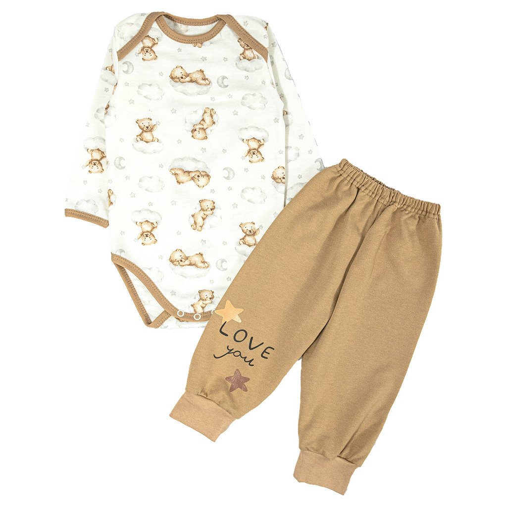 Очаровательный детский костюм создан для тех родителей, которые хотят подарить малышу максимум комфорта без лишних хлопот. Модель состоит из боди и штанишек: оба изделия выполнены из тёплого начёса молочного цвета с принтом мишек, приятного на ощупь и особенно любимого за нежность к чувствительной детской коже. Боди имеет удобную горловину-лодочку, благодаря которой переодевание происходит быстро и аккуратно. Внизу расположены прочные кнопочки. Штанишки на мягкой резинке плотно, но деликатно фиксируются на талии. Манжеты по низу обеспечивают аккуратную посадку и удерживают тепло.