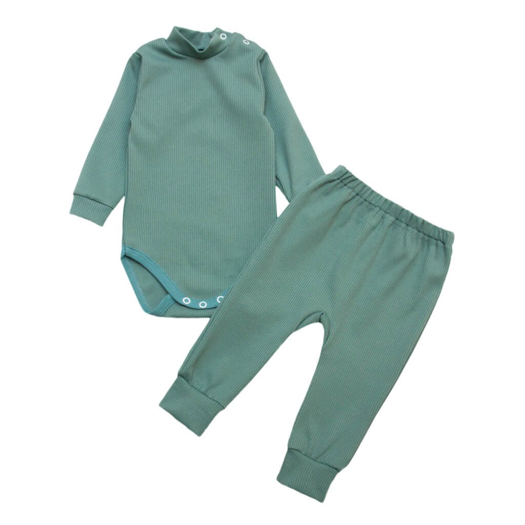 Вашему вниманию представлен новый детский комплект пыльно-мятного цвета, который включает боди-гольф с длинным рукавом и комфортные штанишки. Изделия выполнены из ткани рубчик fitilli, которая тянется, хорошо садится по фигуре и дарит приятные ощущения на коже. Внутренняя сторона гладкая, что делает его особенно комфортным для малыша. Горловина-стойка боди защищает шею от прохлады, а кнопки на плече облегчают процесс переодевания. Штанишки на удобной резинке не давят, но надежно фиксируются на талии. Манжеты на штанинах создают аккуратный вид и не дают ткани задираться. Этот однотонный комплект станет отличным базовым вариантом для прогулок, игр и сна.