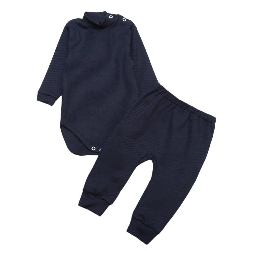 Вашему вниманию представлен новый детский комплект темно-синего цвета, который включает боди-гольф с длинным рукавом и комфортные штанишки. Изделия выполнены из ткани рубчик fitilli, которая тянется, хорошо садится по фигуре и дарит приятные ощущения на коже. Внутренняя сторона гладкая, что делает его особенно комфортным для малыша. Горловина-стойка боди защищает шею от прохлады, а кнопки на плече облегчают процесс переодевания. Штанишки на удобной резинке не давят, но надежно фиксируются на талии. Манжеты на штанинах создают аккуратный вид и не дают ткани задираться. Этот однотонный комплект станет отличным базовым вариантом для прогулок, игр и сна.