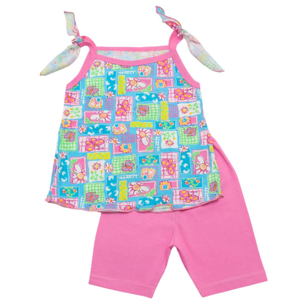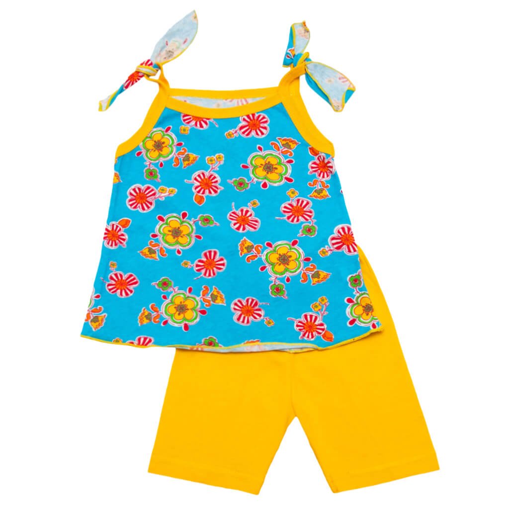 Представленный комплект для девочки, изготовленный из хлопчатобумажного материала - кулир, станет идеальным выбором для Вашей маленькой модницы на теплое время года. Комплект включает в себя маечку на завязках и трессы. Изделия выполнены из лёгкого и дышащего материала кулир, который идеально подходит для пошива летней одежды. На майке присутствует яркий и красочный рисунок, а трессы выполнены в однотонном цвете. На поясе есть мягкая резиночка, которая комфортно зафиксирует изделие на ребёнке. Такой комплект отлично подойдёт для повседневного использования.