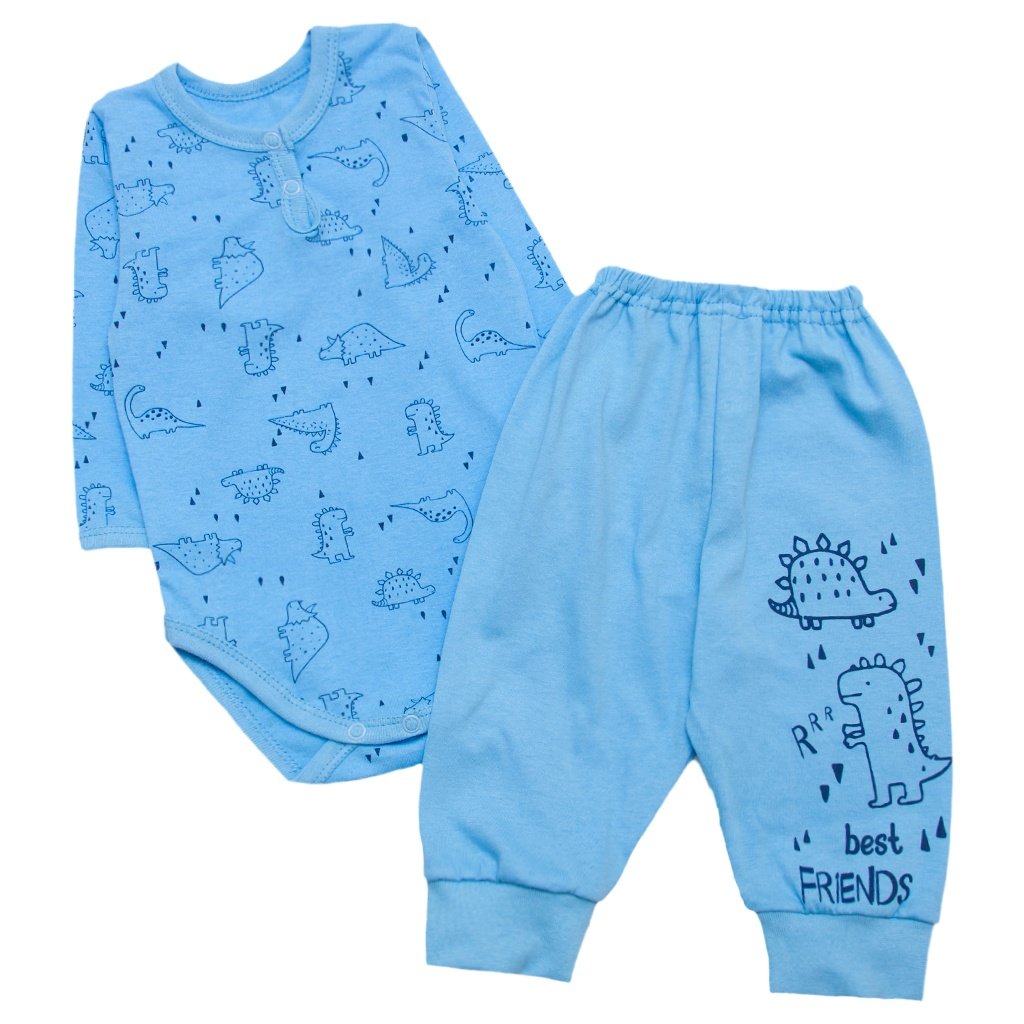 Комплект для малышей - это очень удобно и практично, ведь в комплект собраны необходимые вещи, которые отлично сочетаются между собой. Данный комплект, голубого цвета с принтом динозавры, состоит из боди и штанишек. Боди с длинным рукавом спереди с двумя кнопками, а также с тремя кнопками между ножек для удобства одевания карапуза. Невероятно крутой комплект для мальчика, идеальный вариант для вечерних прогулок, в прохладное время года. Бодик имеет милые рисунки по всему периметру. Штанишки с манжетами, изготовлены из однотонного полотна. Сбоку на штанишках есть покраска, за счёт цвета и рисунка они идеально подходят к бодику. Рекомендуем Вам приобрести этот комплект в нескольких расцветках, Вы точно останетесь довольны!