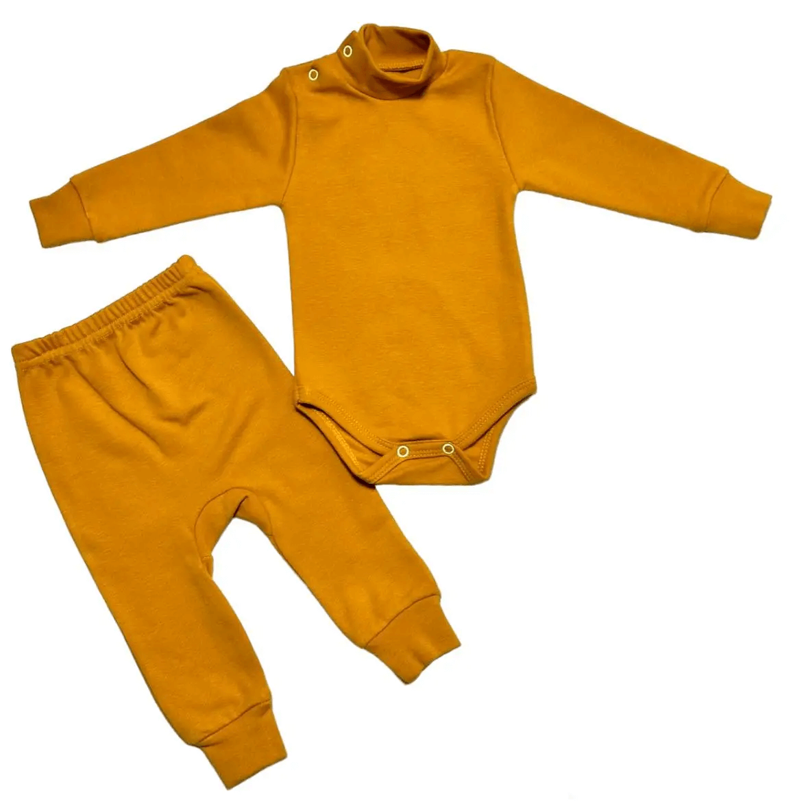 Приобрести качественный трикотажный комплект для своего малыша Вы сможете в нашем интернет-магазине ТМ Арлекин! Вашему вниманию представлена новая модель детского комплекта, который состоит из боди-гольфа и штанишек горчиченого цвета. Изделия изготовлены из высококачественного стрейчевого интерлока с небольшим начесом. Комплект обеспечивает приятное прилегание к коже и дополнительное тепло в холодные дни. Боди-гольф застёгивается на кнопочки, которые есть возле горловины и между ножек. Штаны на эластичной мягкой резинке, которая отлично зафиксирует изделие на ребёнке.
