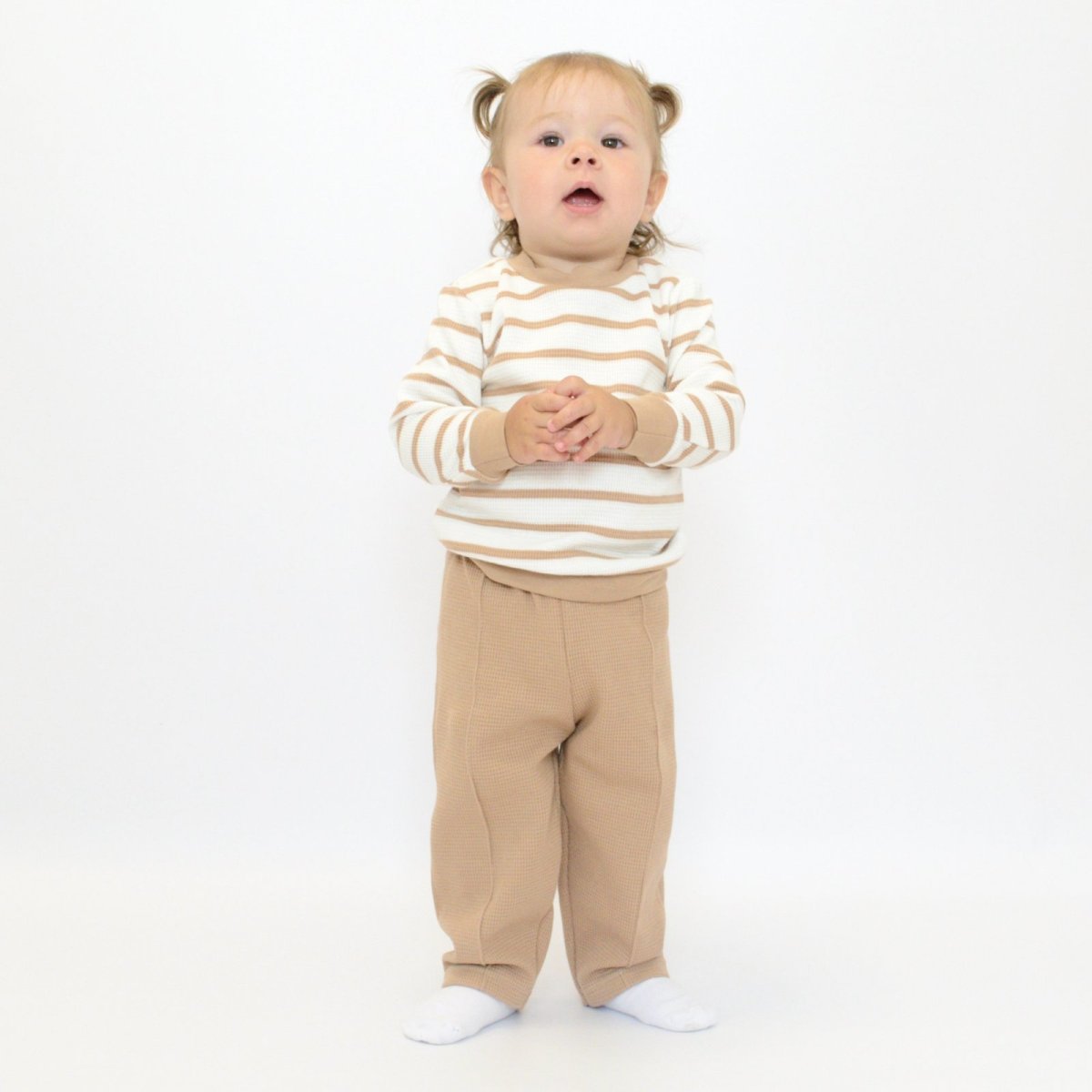 Детский костюм, который состоит из джемпера молочного цвета в бежевую полоску и штанишек бежевого цвета, пошит из вафельного трикотажного полотна и подарит малышу абсолютный комфорт в любое время года. Легкая текстурированная ткань обеспечивает приятные ощущения на коже, позволяя коже дышать и не перегреваясь. Кофта украшена стильным принтом, а контрастные манжеты добавляют образу завершенности. Брюки имеют комфортную посадку, не сковывают движения и подходят для активных игр. Несколько расцветок позволят выбрать вариант на любой вкус, а прочность ткани обеспечит долговечность изделия даже после многократных стирок.