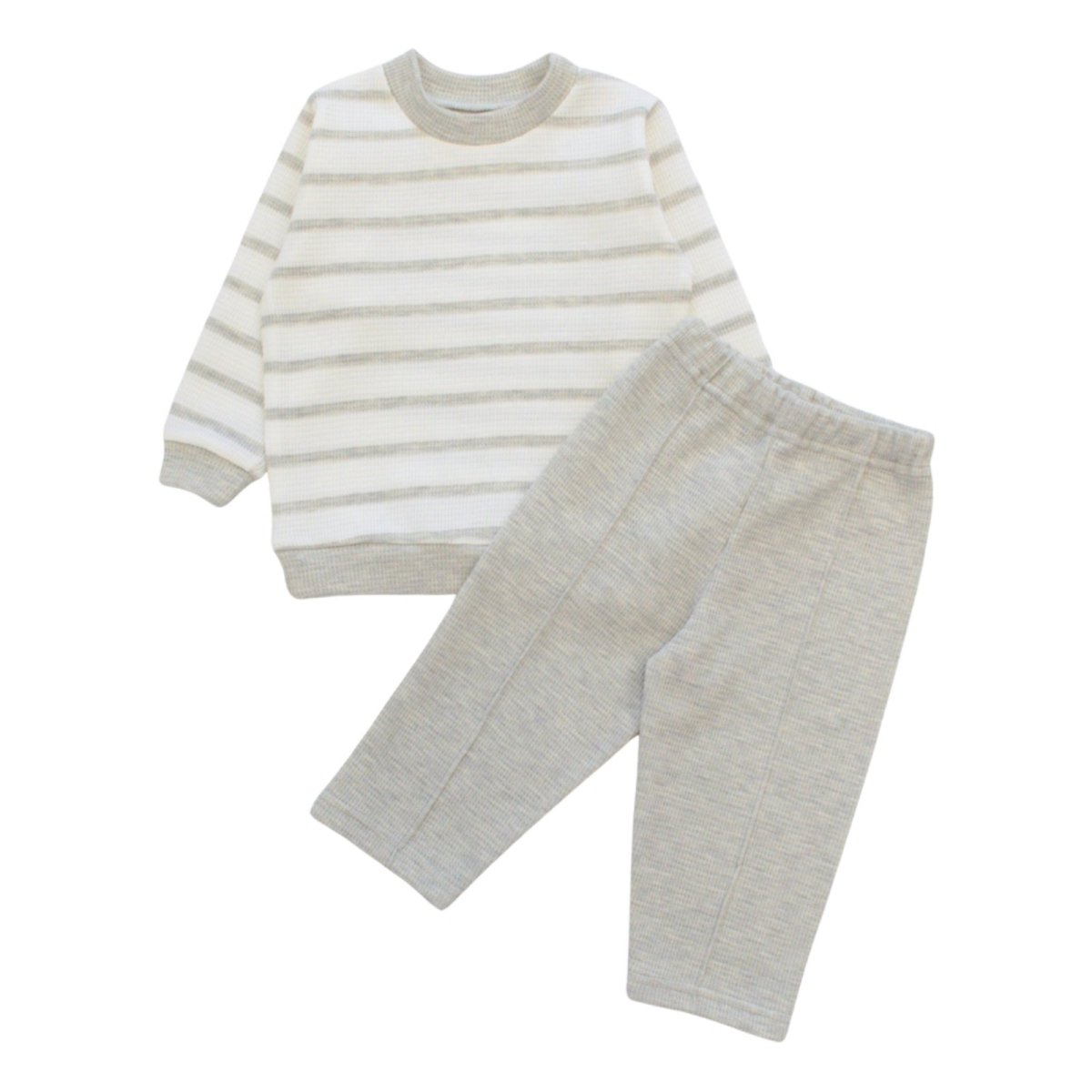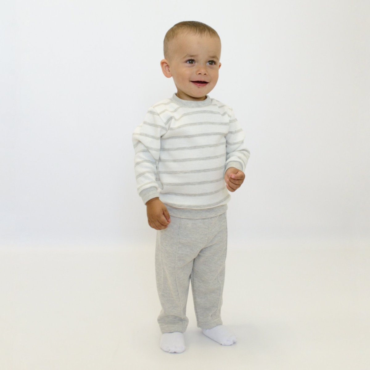 Детский костюм, который состоит из джемпера молочного цвета в серую полоску и штанишек серого цвета, пошит из вафельного трикотажного полотна и подарит малышу абсолютный комфорт в любое время года. Легкая текстурированная ткань обеспечивает приятные ощущения на коже, позволяя коже дышать и не перегреваясь. Кофта украшена стильным принтом, а контрастные манжеты добавляют образу завершенности. Брюки имеют комфортную посадку, не сковывают движения и подходят для активных игр. Несколько расцветок позволят выбрать вариант на любой вкус, а прочность ткани обеспечит долговечность изделия даже после многократных стирок.