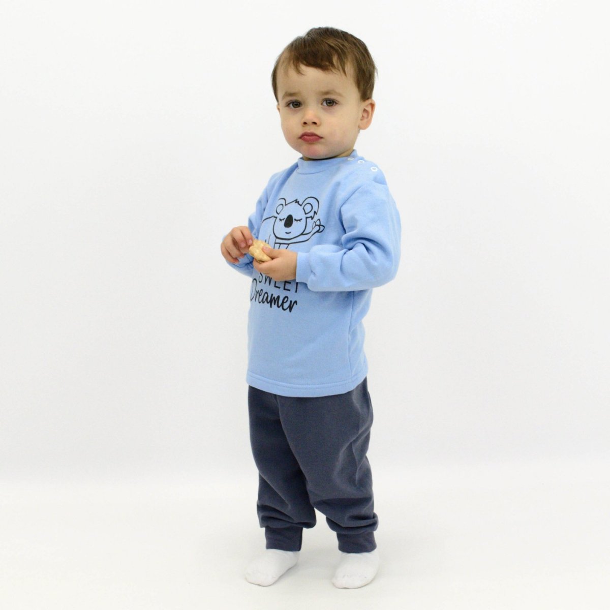 Ясельный костюм для маленьких девочек и мальчиков пошит из тёплого полотна начес, это на 100% хлопковая ткань, что является огромным плюсом. Однотонная детская водолазка голубого цвета с горловиной-стойкой и кнопками на одном плече спереди украшена нанесённым рисунком коалы. Штанишки серого цвета подобраны под водолазку в наиболее подходящем цвете. Штанишки без карманов, на манжетах, ещё по-другому их называют детские гамаши - комфортные во время носки, свободные по крою и отлично подойдут под памперс. Такой детский костюмчик на зиму, осень и холодную весну - идеальный вариант!