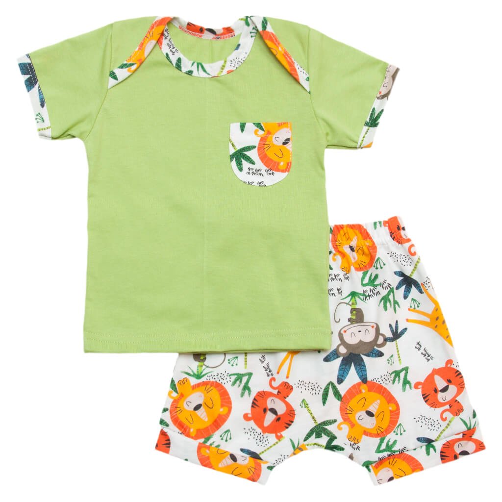 Невероятно красивый и яркий детский комплект, зеленого цвета с принтом сафари - отличный вариант на жаркое время года. Летний комплект состоит из футболочки и шортиков. Изделия пошиты из высококачественного кулира-пенье. Такое полотно отлично держит свою форму, не садится и достаточно эластичное. Футболка изготовлена из однотонного полотна, а как дополнение выступает кармашек спереди и красочная бейка, которой обработано края. Шортики полностью изготовлены из полотна с различными рисуночками. Также шорты отлично закрепяться на Вашем малыше при помощи резинки. Такой комплект выглядит невероятно красиво и очень ярко. Скорее оформляйте заказ на нашем сайте!