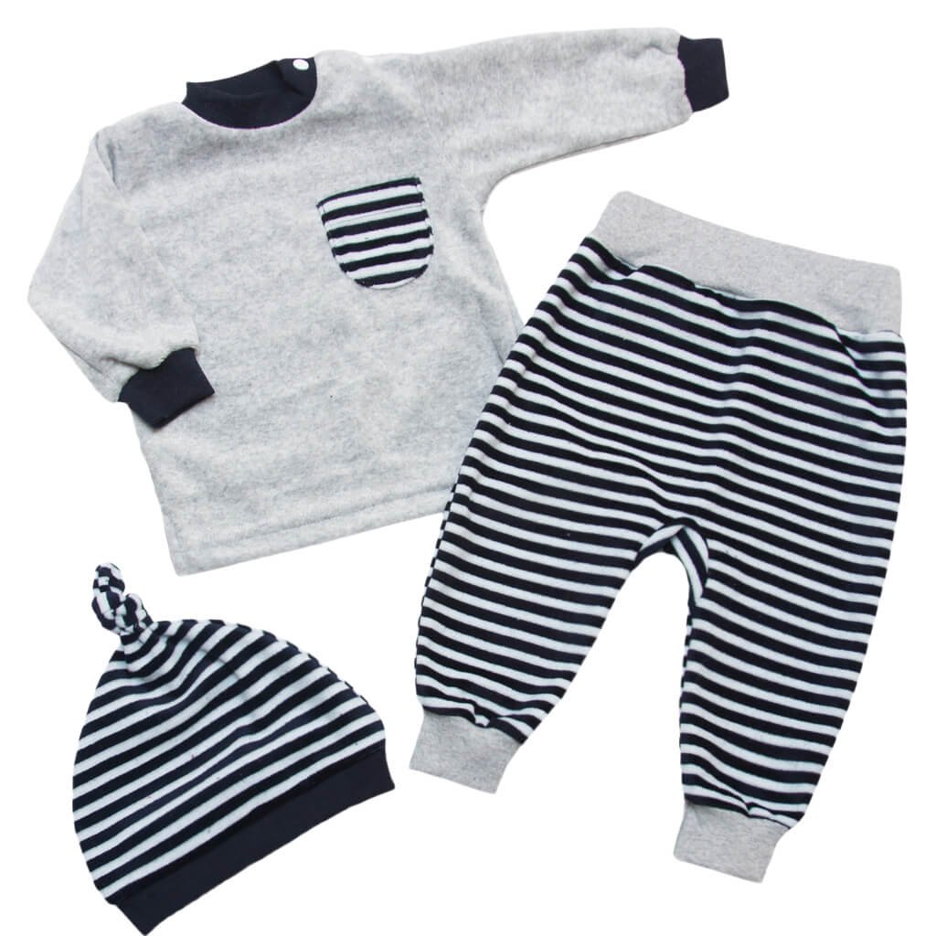 Детский велюровый костюмчик состоит из трёх изделий: кофточки, штанишек и шапки. Такой комплект выполнен из комбинации двух цветов, серый и черный. Велюр - очень надежное и износостойкое полотно, после многочисленных стирок оно не деформируется и сохраняет свою первоначальную форму. Также велюр невероятно мягкая ткань, поэтому этот материал отлично подходит для пошива детской одежды. По краях кофты и штанишек выполнены манжеты. Возле горловины кофты есть две небольшие кнопочки, а спереди присутствует небольшой кармашек. Такой детский комплект точно понравится Вам и Вашему карапузу!