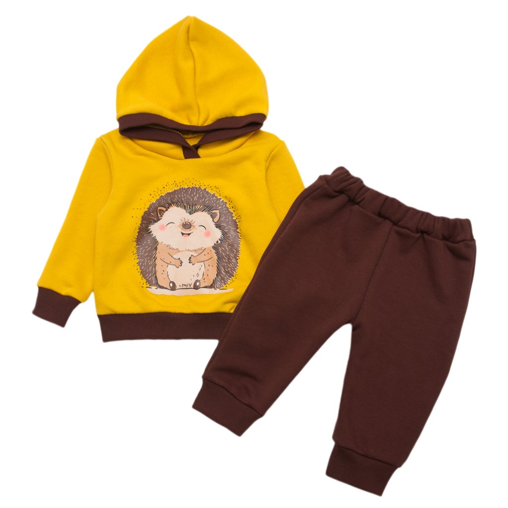 Ассортимент детской одежды нашего интернет-магазина «Арлекин» пополнился чудесными комплектами желтых кофточек и коричневых штанишек, принт Ежик. Представленная модель комплекта пошита из трикотажной ткани - хлопок петля. Такой материал довольно часто используется при пошиве детской тёплой одежды, так как состав полотна полностью экологичный. Изделия достаточно свободного кроя, поэтому Вашему малышу точно будет очень комфортно в таком комплекте. На кофте присутствует капюшон.