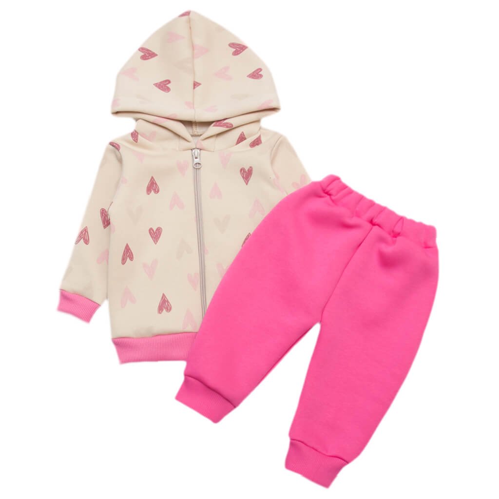 Кофта на замке и штанишки - идеальная комбинация детского комплекта! Оба изделия свободны по крою, пошиты из тёплой трёхнитки. Малышу будет комфортно и очень уютно в таком комплекте. Бежевая кофточка с принтом сердечки с капюшоном, на рукавах, по низу и краю капюшона обработана стрейчем, который гармонично подобран к основному цвету полотна. Такой же стрейч присутствует и по низу штанишек. Детские штаны розового цвета на широкой, мягкой резинке, она отлично тянется и при правильном подборе размера не будет давить на животик малыша. Кофточку можно надеть поверх футболки или водолазки, которые Вы также можете приобрести в каталоге нашего интернет-магазина!