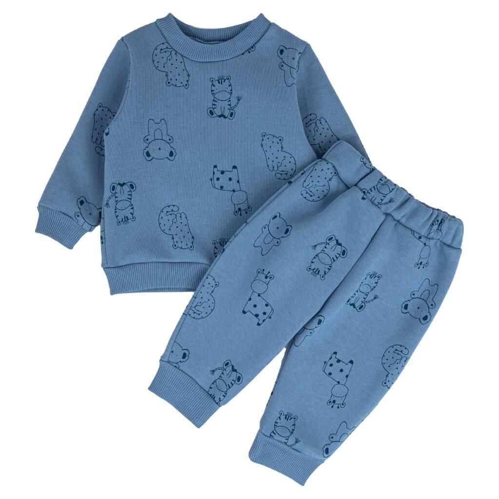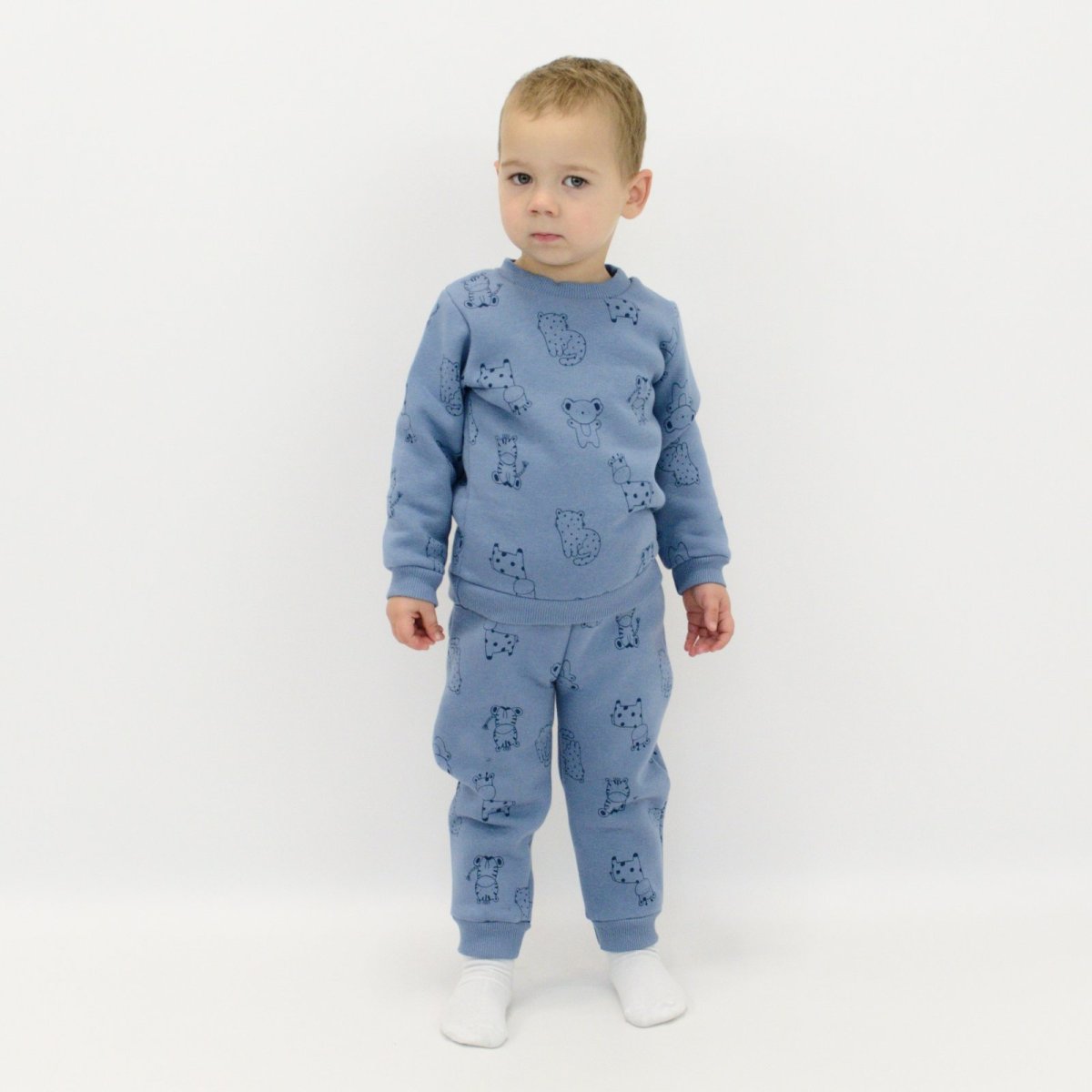 Комплект серо-голубого цвета для мальчика состоит из кофточки и штанишек, изготовлен из качественного тёплого трикотажного полотна - трёхнитка. Детский свитшот внизу, по рукавам и горловине обработан стрейчем, который хорошо тянется и не деформируется. Кофточка пошита из ткани с принтом сафари и детские штанишки с принтом отлично комбинируются с таким верхом. Штанишки с манжетами - это идеальный вариант для деток, ведь можно не боясь приобрести размер с небольшим запасом, чтобы карапуз дольше мог ходить в своей обновке. Желаем Вам приятных покупок с ТМ "Арлекин".